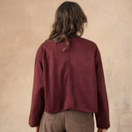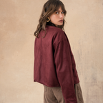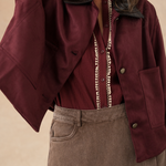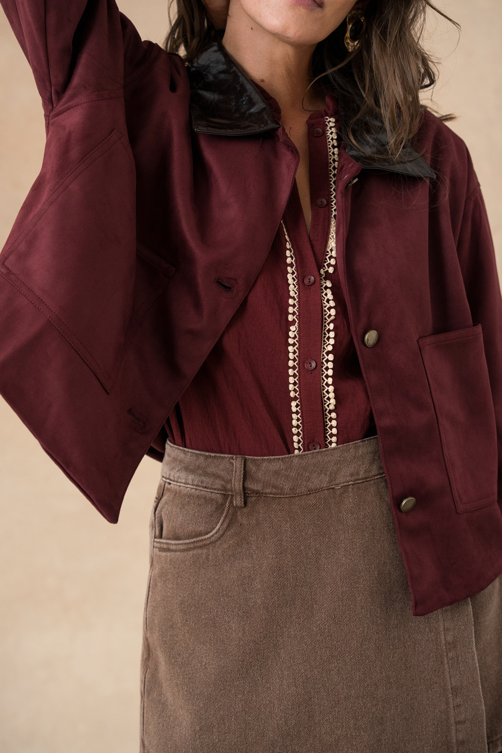 Sa coupe droite minimaliste s’associe à un col noir effet verni qui contraste avec l’intensité du bordeaux. Un détail chic qui apporte de la modernité à cette pièce intemporelle. On aime son allure affirmée, idéale pour sublimer un look de jour comme de soirée.