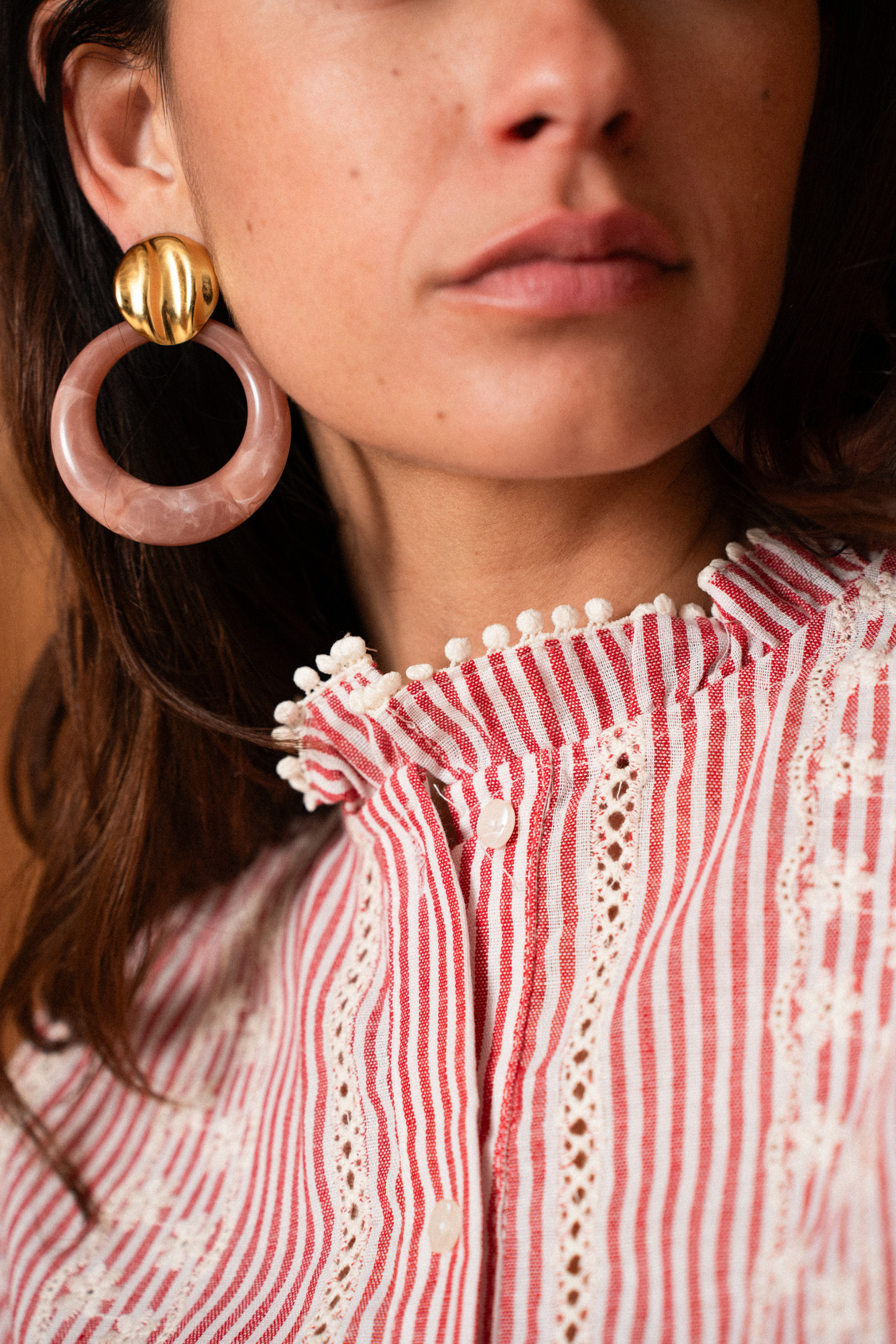 Leur clou doré texturé capte la lumière, tandis que l’anneau en acétate marbré apporte cette touche douce et moderne qui fait toute leur allure.