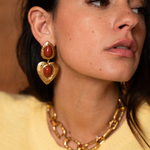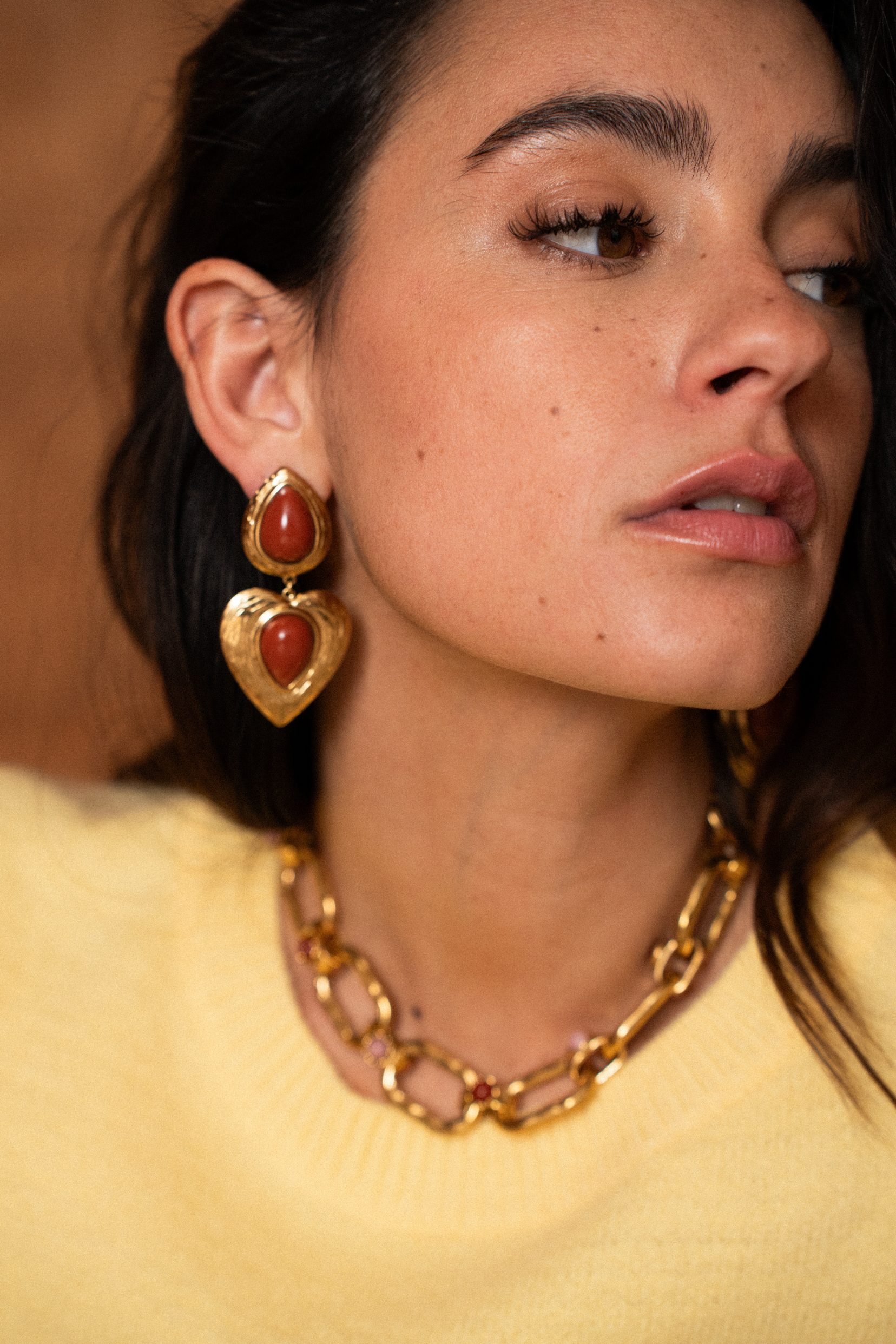 Leur doré texturé encadre une goutte de résine colorée, comme un éclat précieux posé tout près du visage.