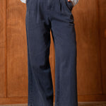 Sa coupe large et taille haute allonge la silhouette, tandis que ses plis marqués structurent le tombé pour un rendu à la fois décontracté et raffiné. Inspiré du tailoring, mais travaillé dans un denim brut, il conjugue confort et caractère.
