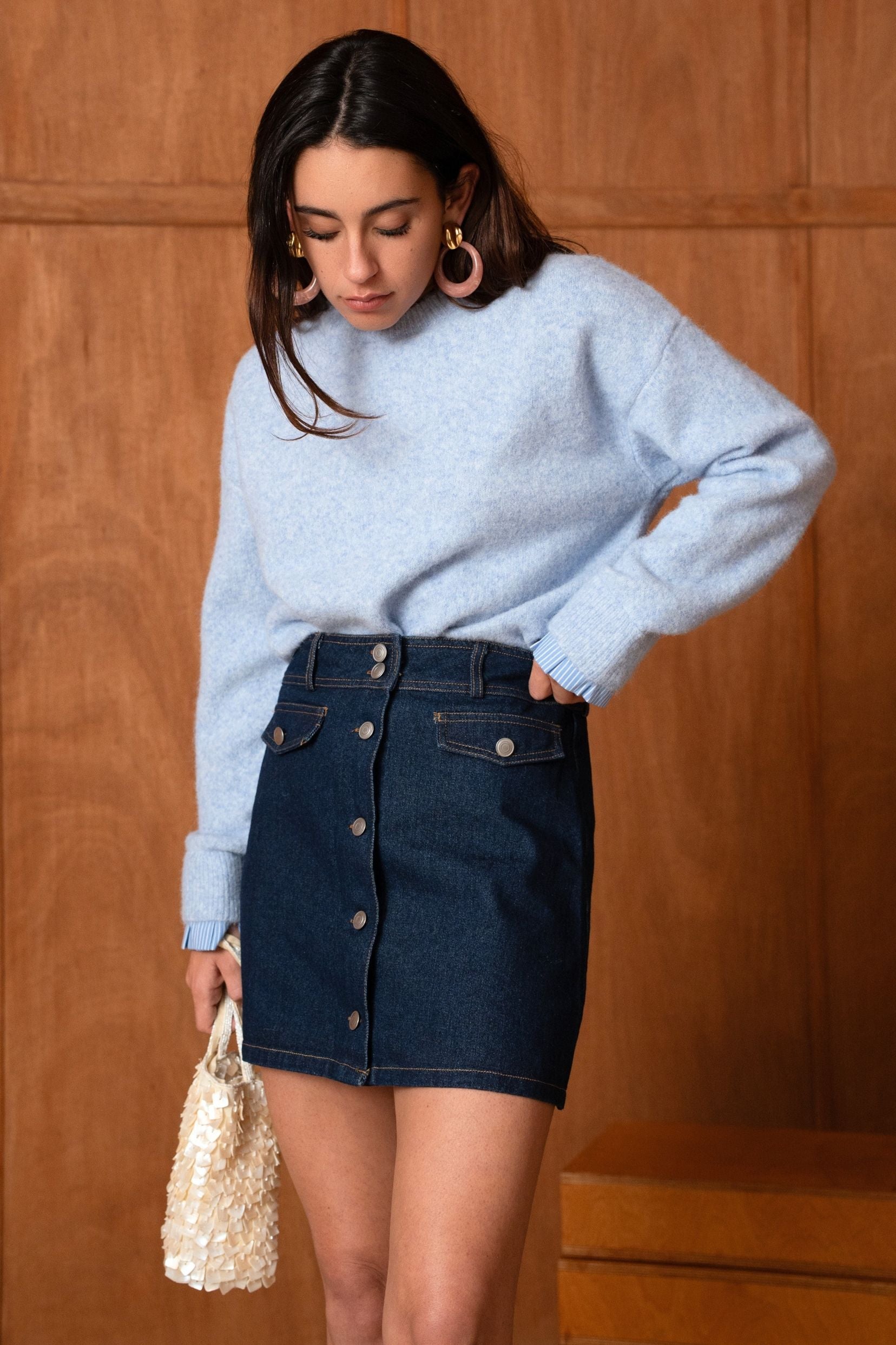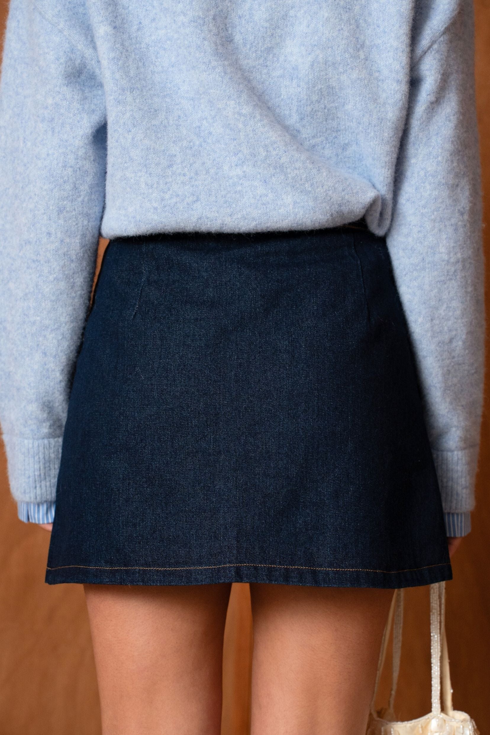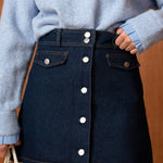Sa coupe légèrement trapèze flatte la silhouette, tandis que ses surpiqûres contrastées et sa rangée de boutons apportent une touche rétro comme on les aime. Simple, efficace, et toujours juste c’est la jupe qu’on attrape sans réfléchir, celle qui va avec tout.