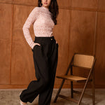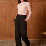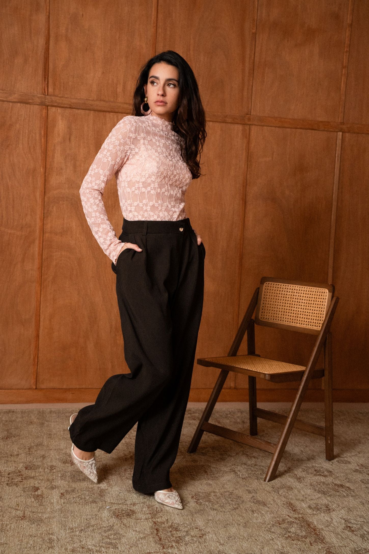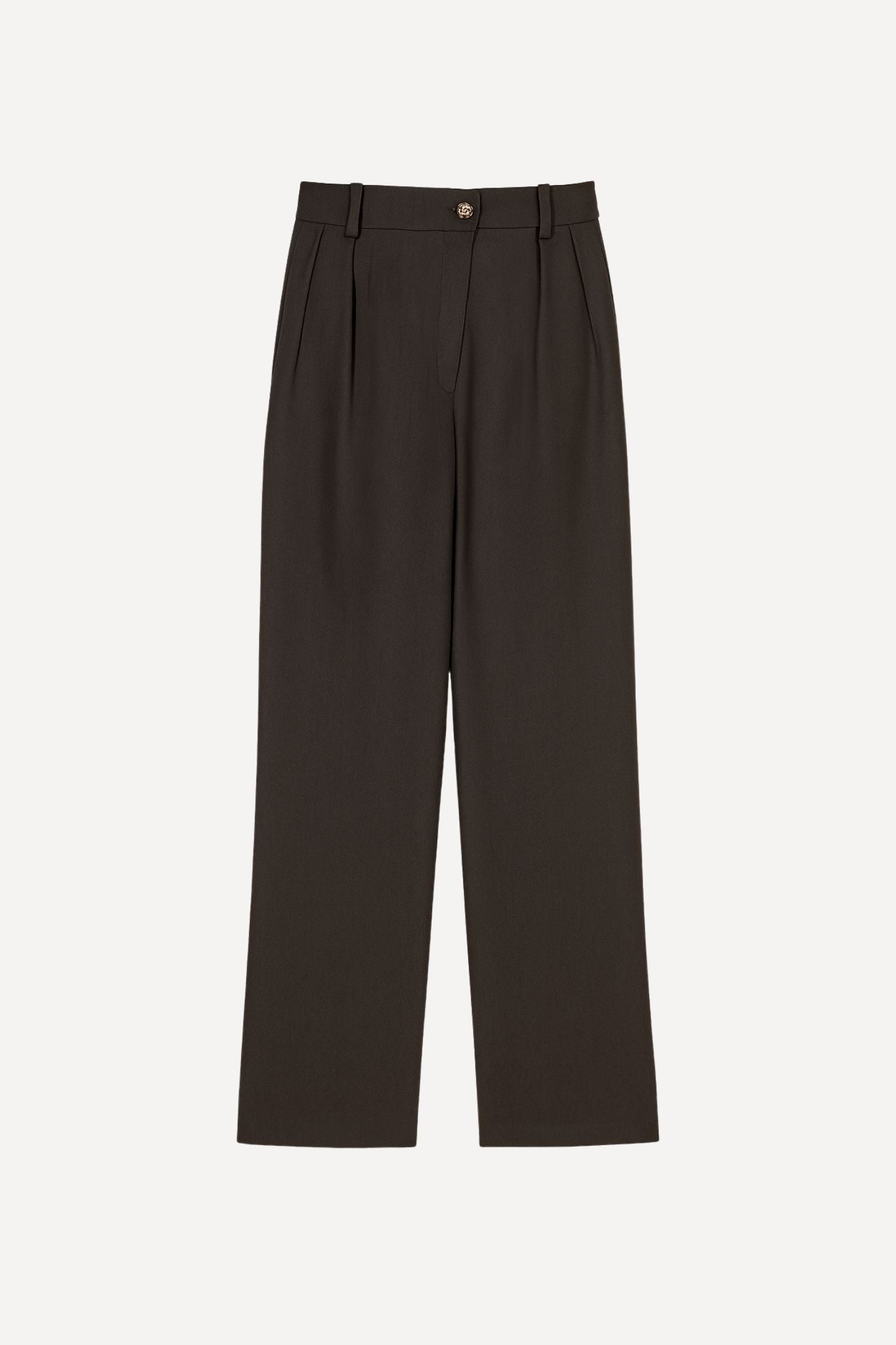 Sa coupe fluide et sa taille haute dessinent une silhouette allongée, tandis que son tombé souple apporte une allure naturelle et assurée. Dans son coloris chocolat profond, il devient une alternative chic au noir, parfait pour réchauffer les looks d’automne.