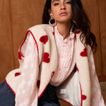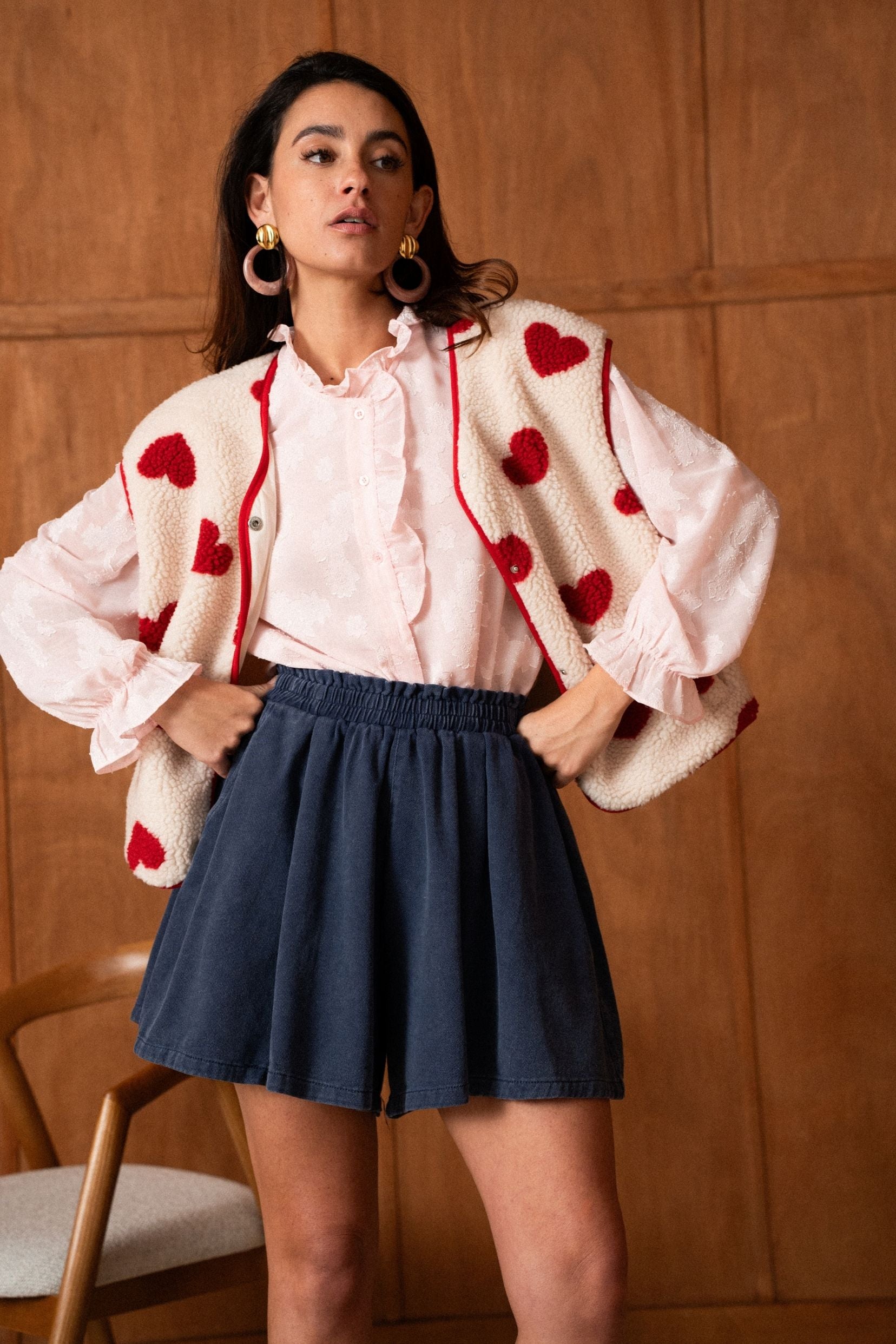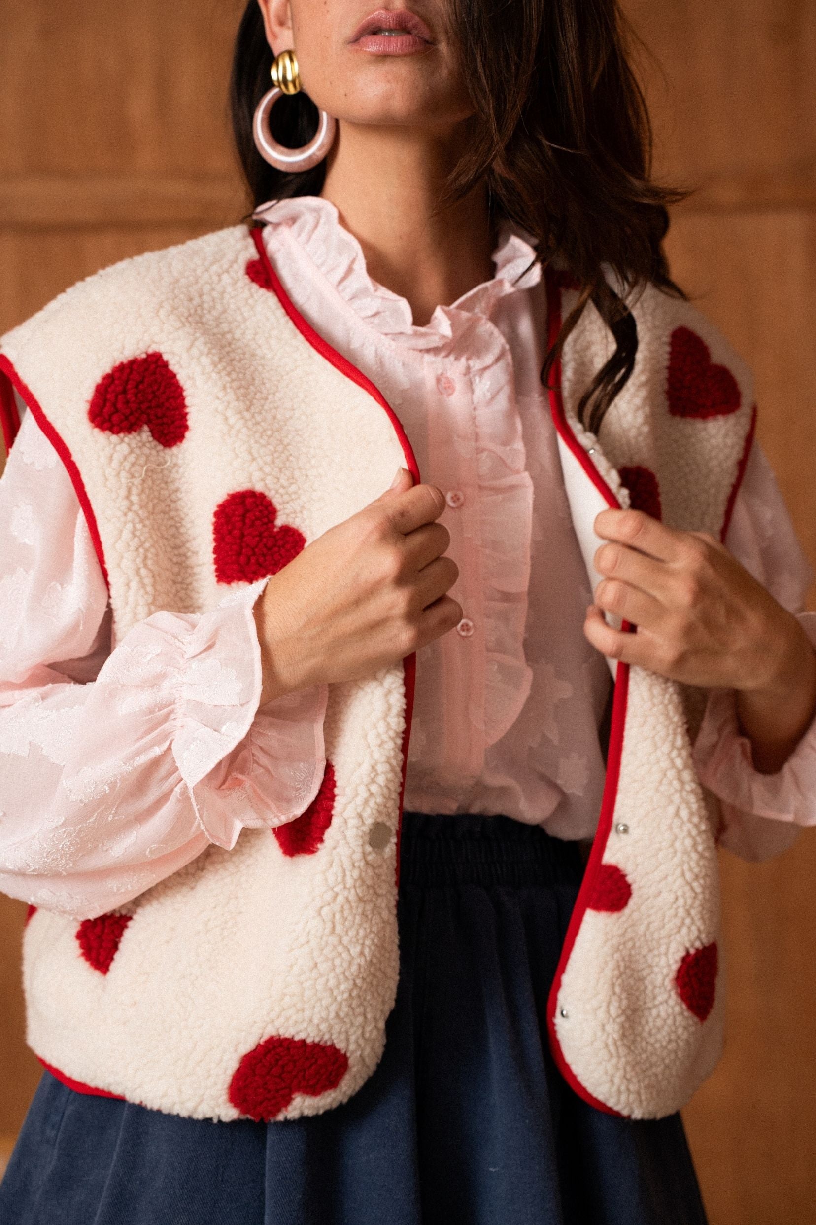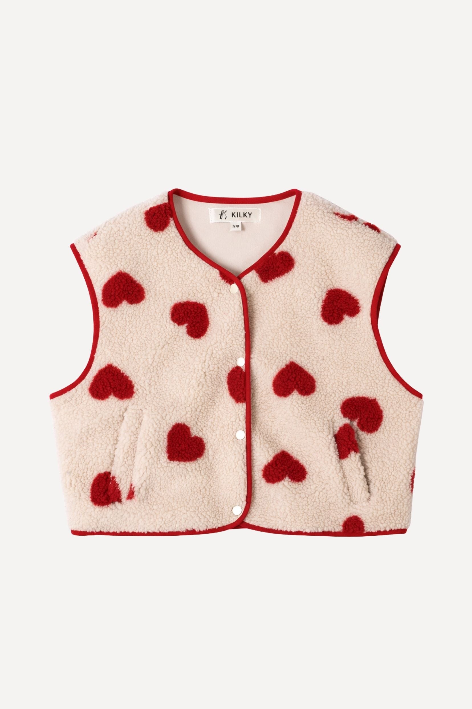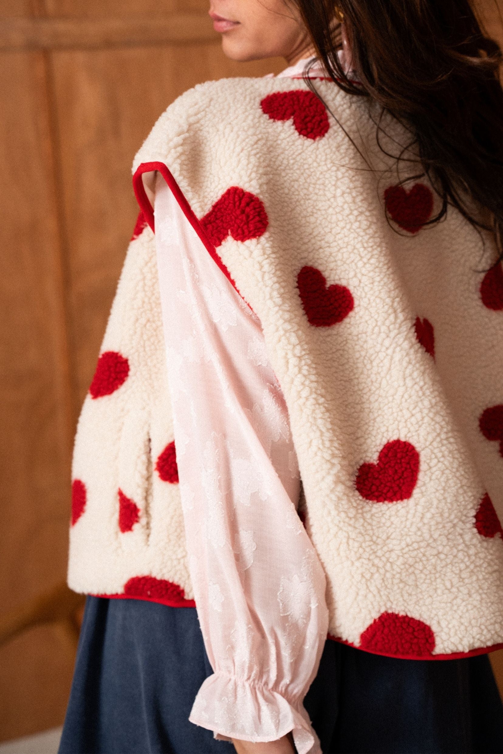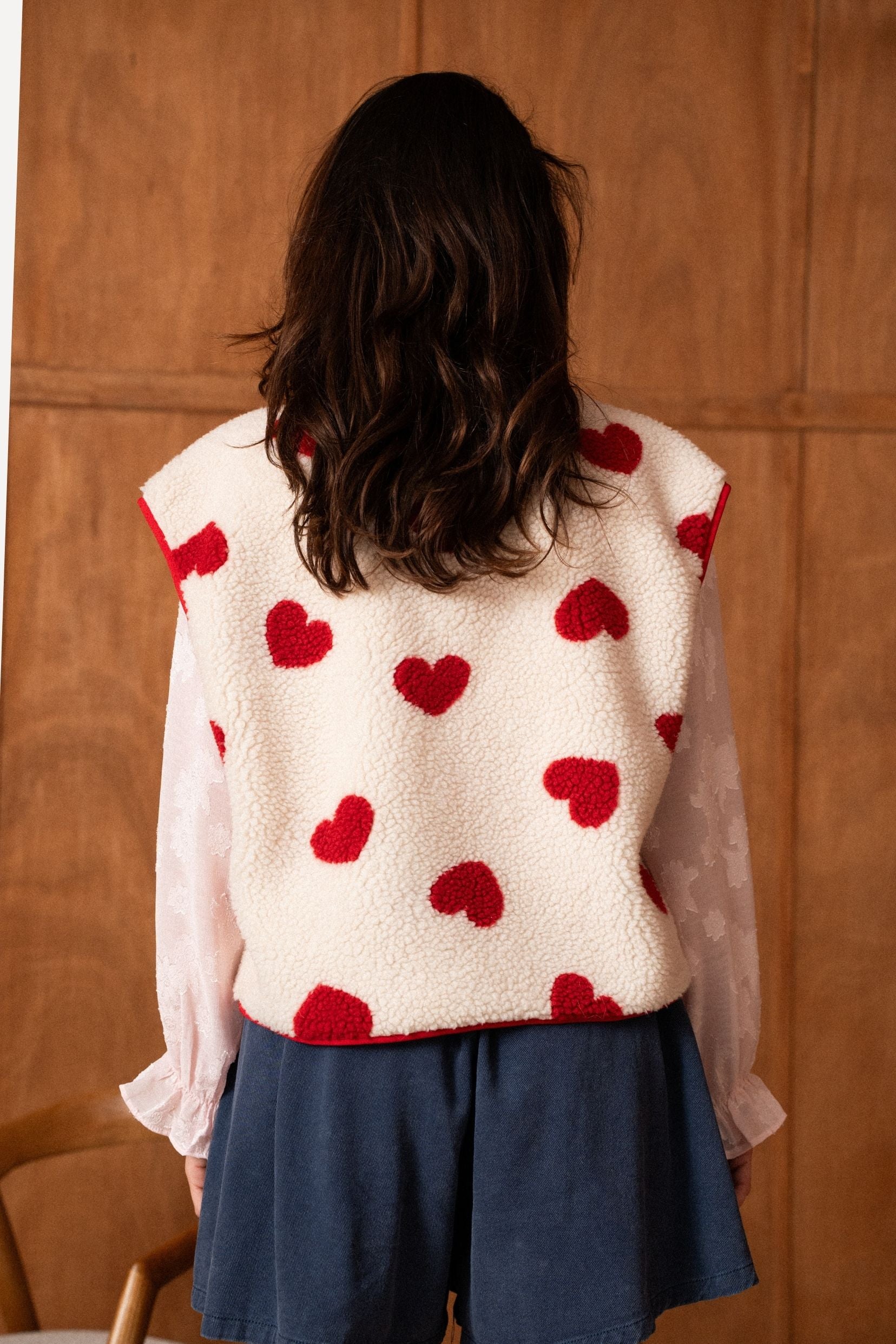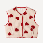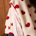 Sa matière effet moutonné invite immédiatement au confort, tandis que les motifs cœurs rouges apportent un contraste joyeux et assumé. Une pièce qui réchauffe les silhouettes tout en affirmant un vrai parti pris stylistique.