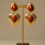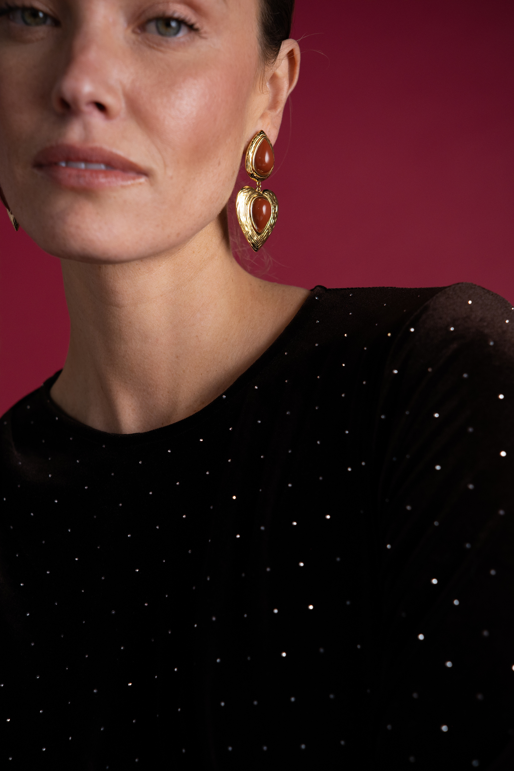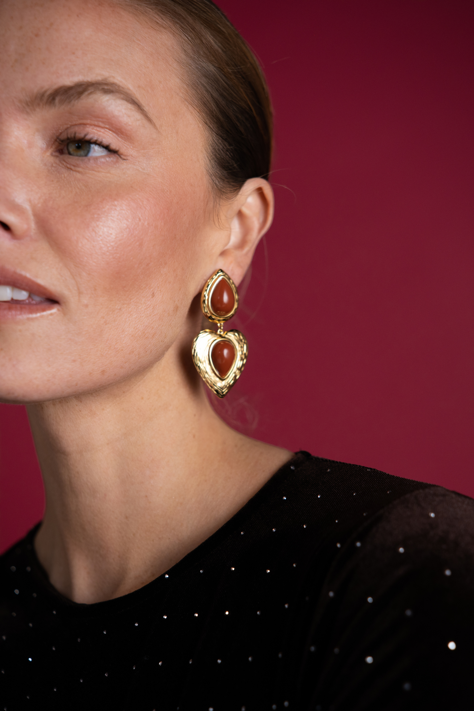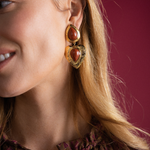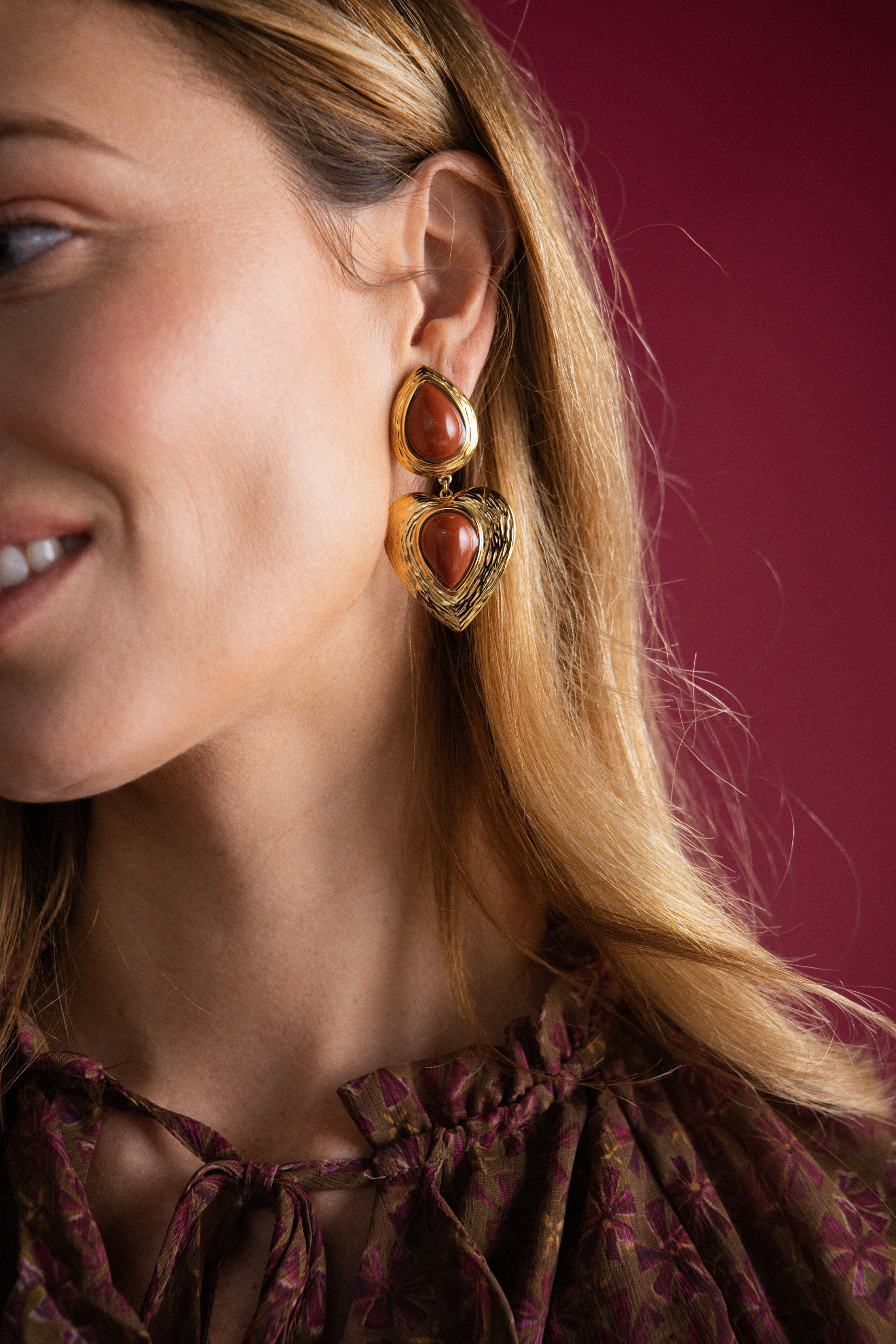 Leur doré texturé encadre une goutte de résine colorée, comme un éclat précieux posé tout près du visage.