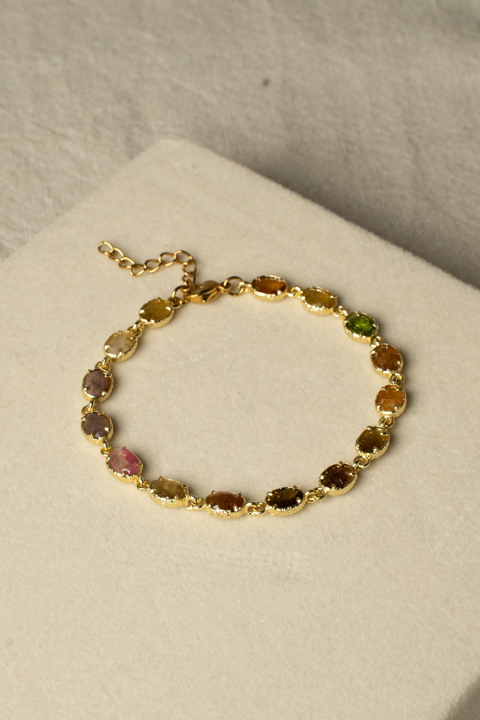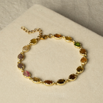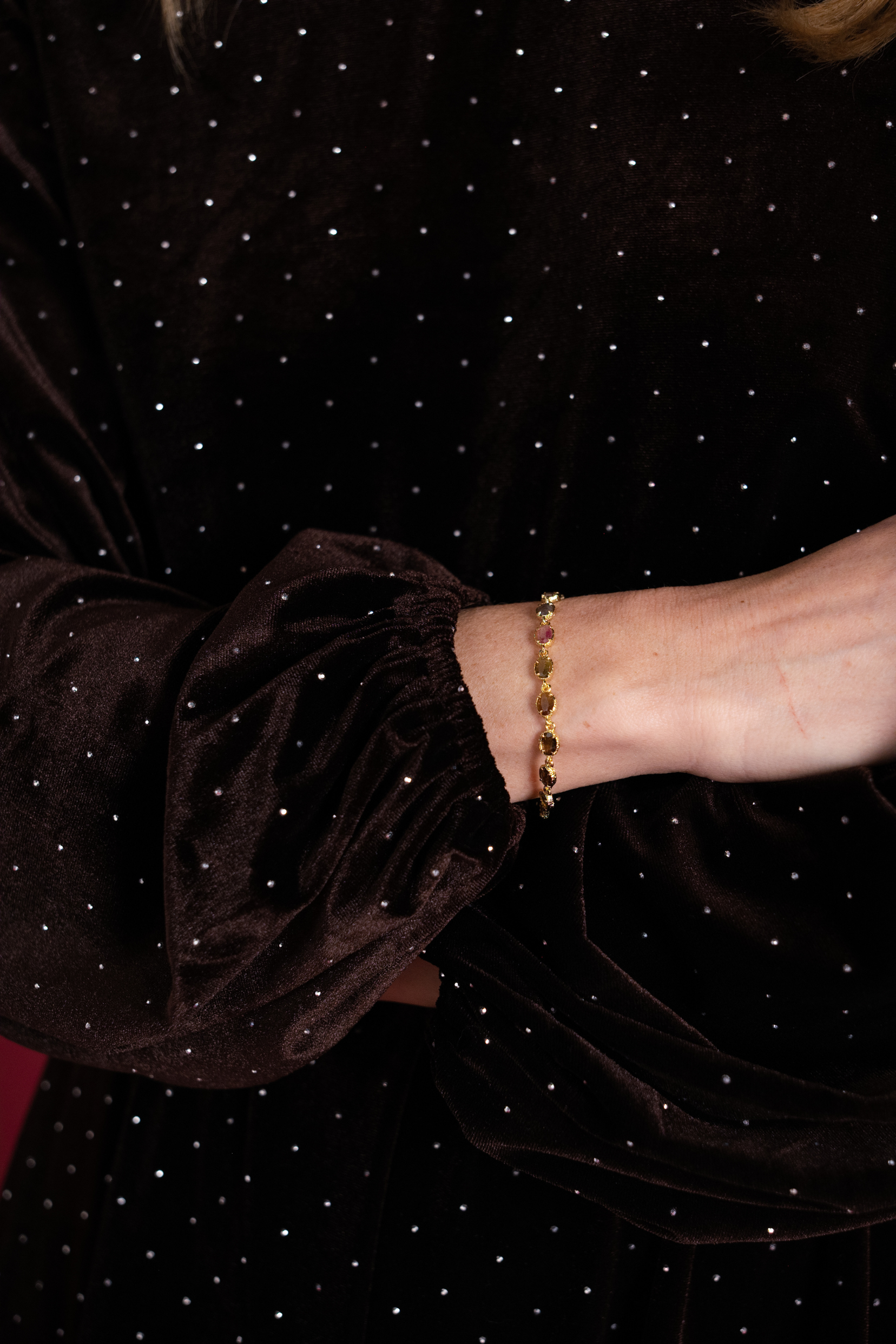 Ses éclats de tourmaline, chacun dans sa nuance rose doux, vert profond, teintes fumée ou miel composent un camaïeu délicat, comme une palette d’aquarelle portée au poignet.