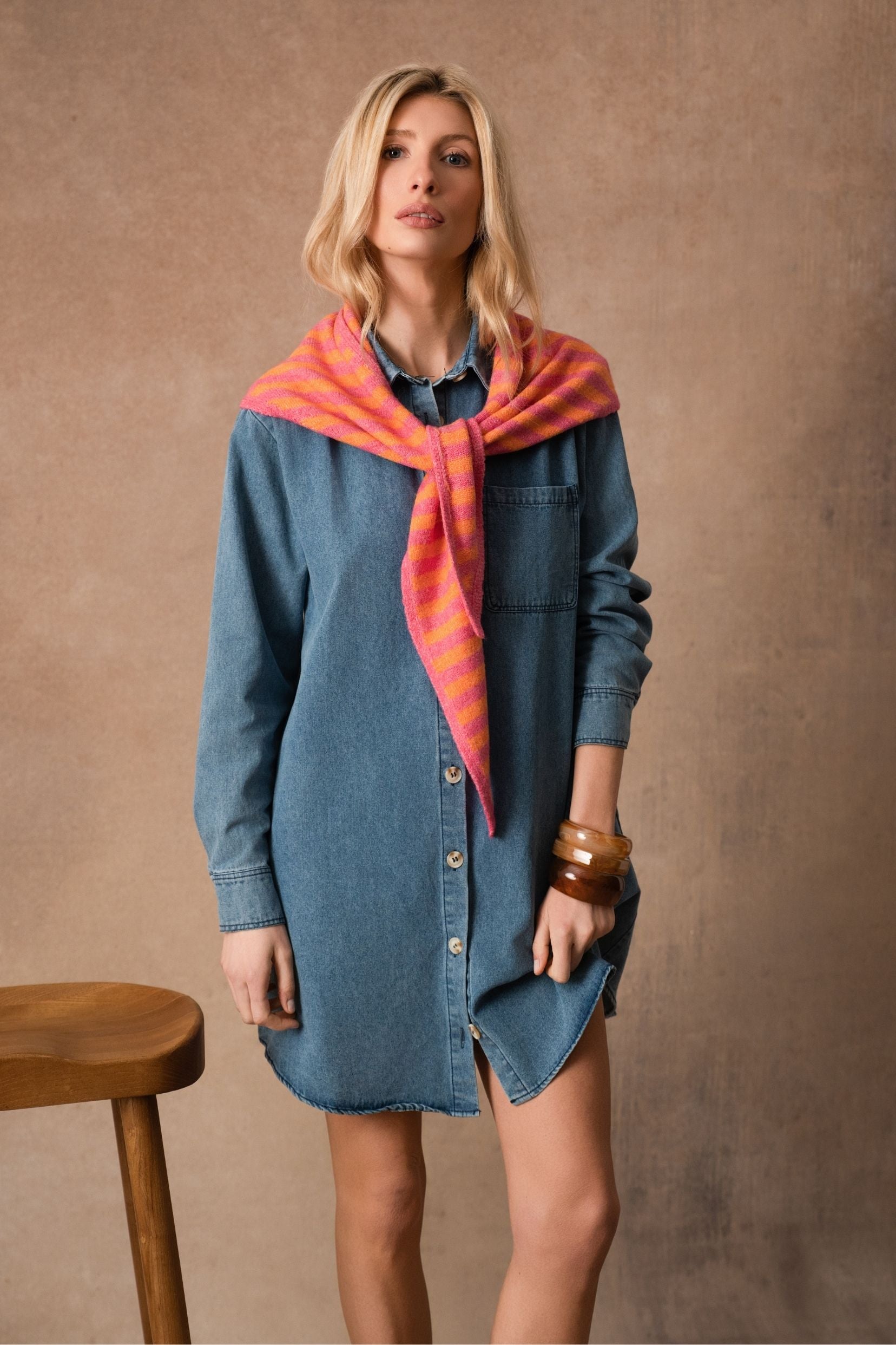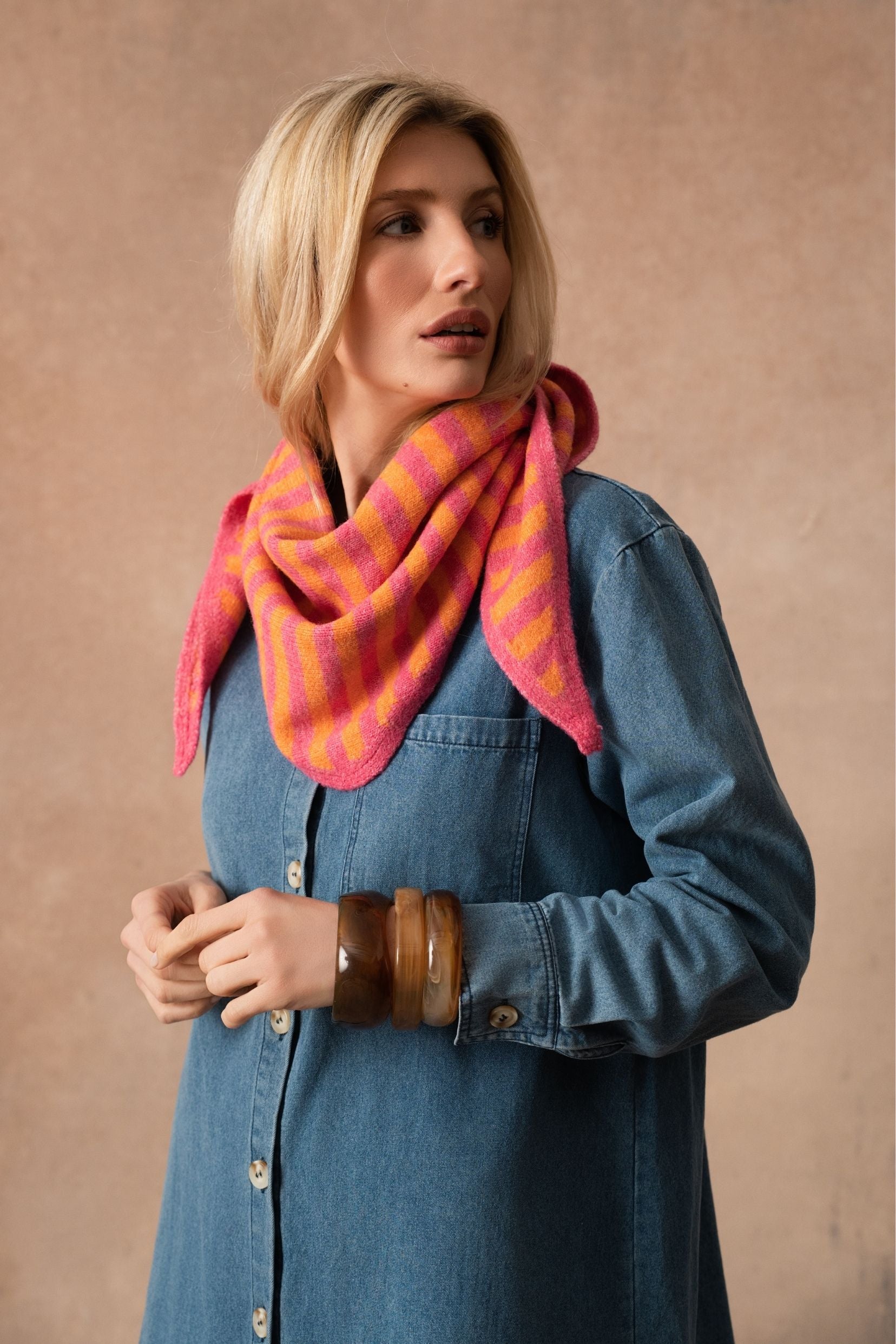 Élio revient dans une version plus pétillante et s’empare de la tendance des rayures. C’est un accessoire que l’on adopte sans hésiter pour illuminer un manteau sombre ou adoucir une tenue plus structurée.