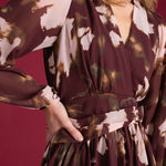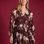 Un imprimé bordeaux aux accents artistiques, presque picturaux, qui donne à la silhouette un mouvement vivant et chaleureux. Sa coupe fluide, son décolleté croisé et son nœud placé à la taille sculptent une allure féminine, douce et affirmée.