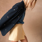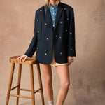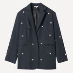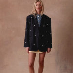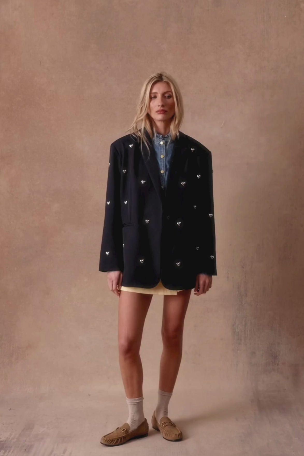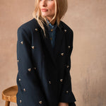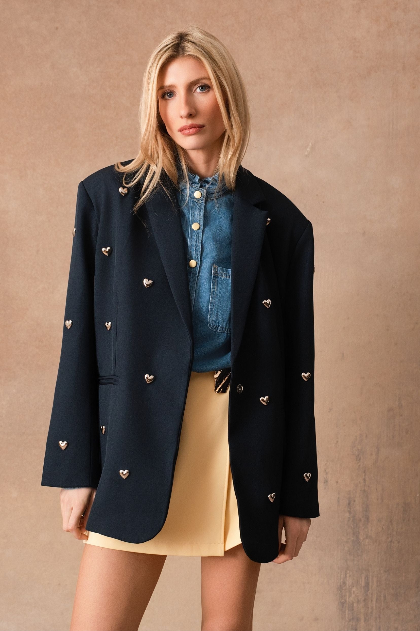 Perrine, c’est la veste de costume qui change tout. Une coupe classique, chic et parfaitement maîtrisée… enrichie de petits cœurs métalliques qui viennent poser une note espiègle et féminine. Un twist subtil qui transforme une pièce intemporelle en véritable signature Kilky Paris : audacieuse, douce, un brin romantique.