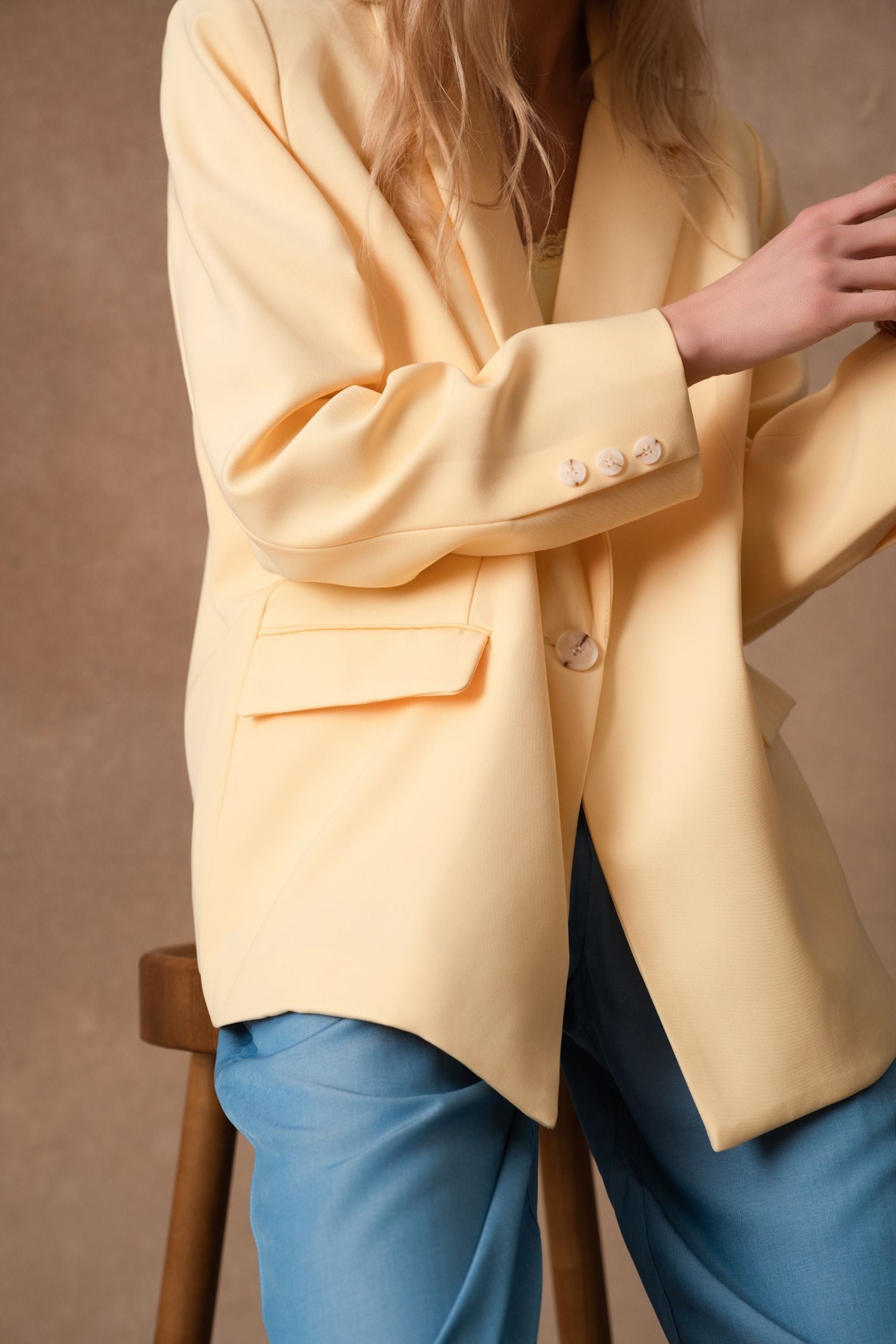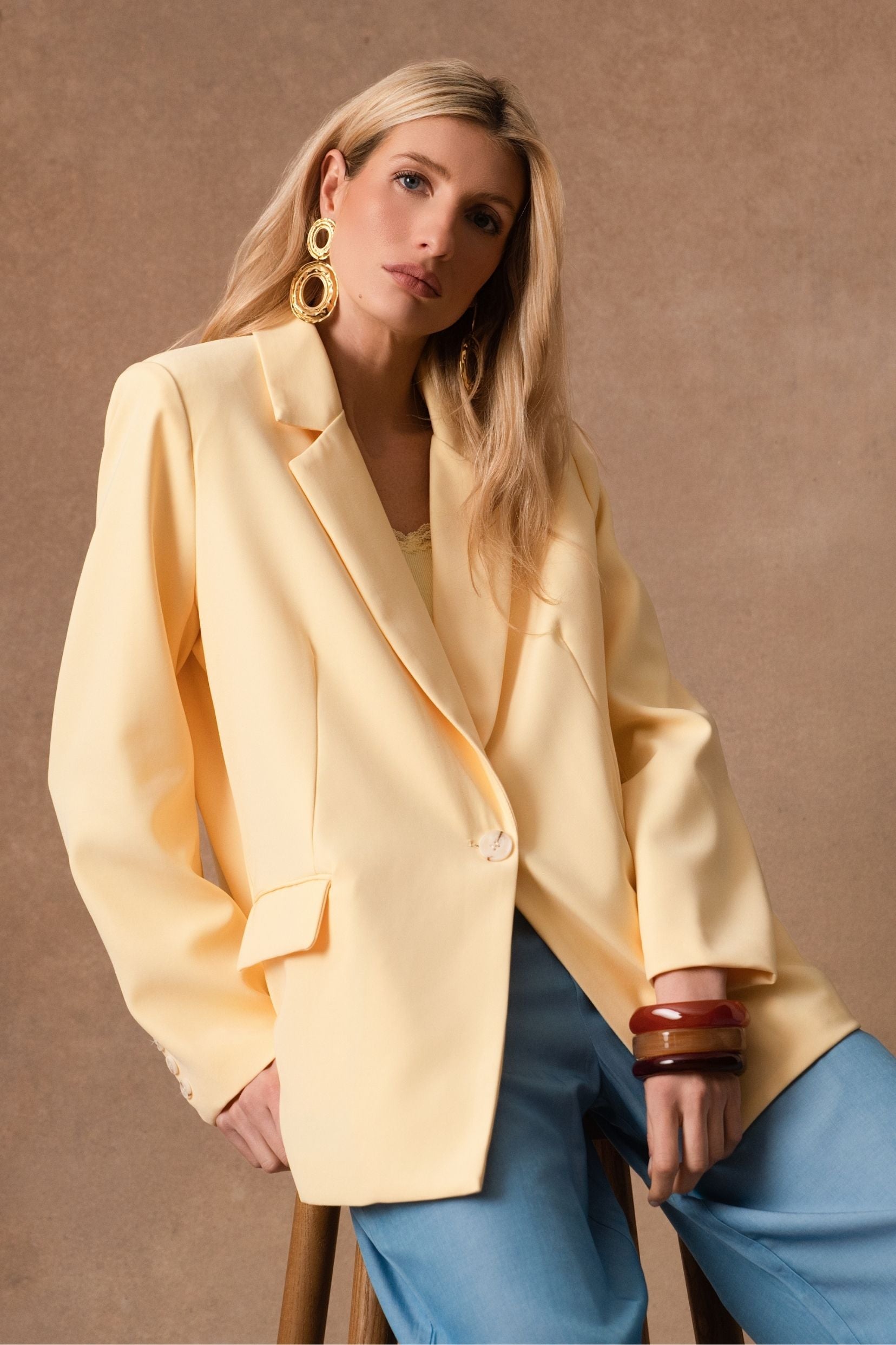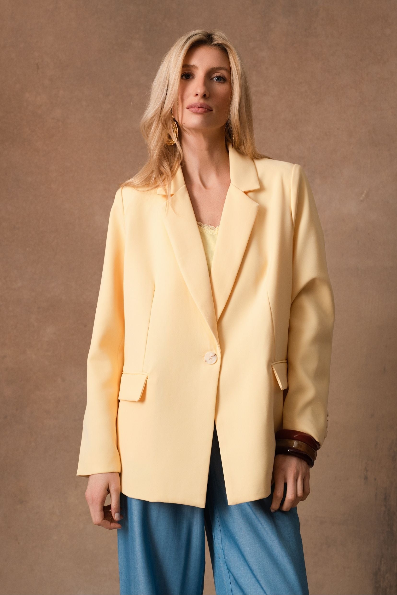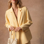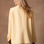 Wendy, la veste qui traverse les saisons avec une élégance naturelle, se décline désormais en jaune lumineux. Sa ligne de costume, nette mais jamais stricte, structure la silhouette avec douceur. Le jaune soleil réchauffe les looks et s’accorde à tout, du plus minimal au plus habillé.