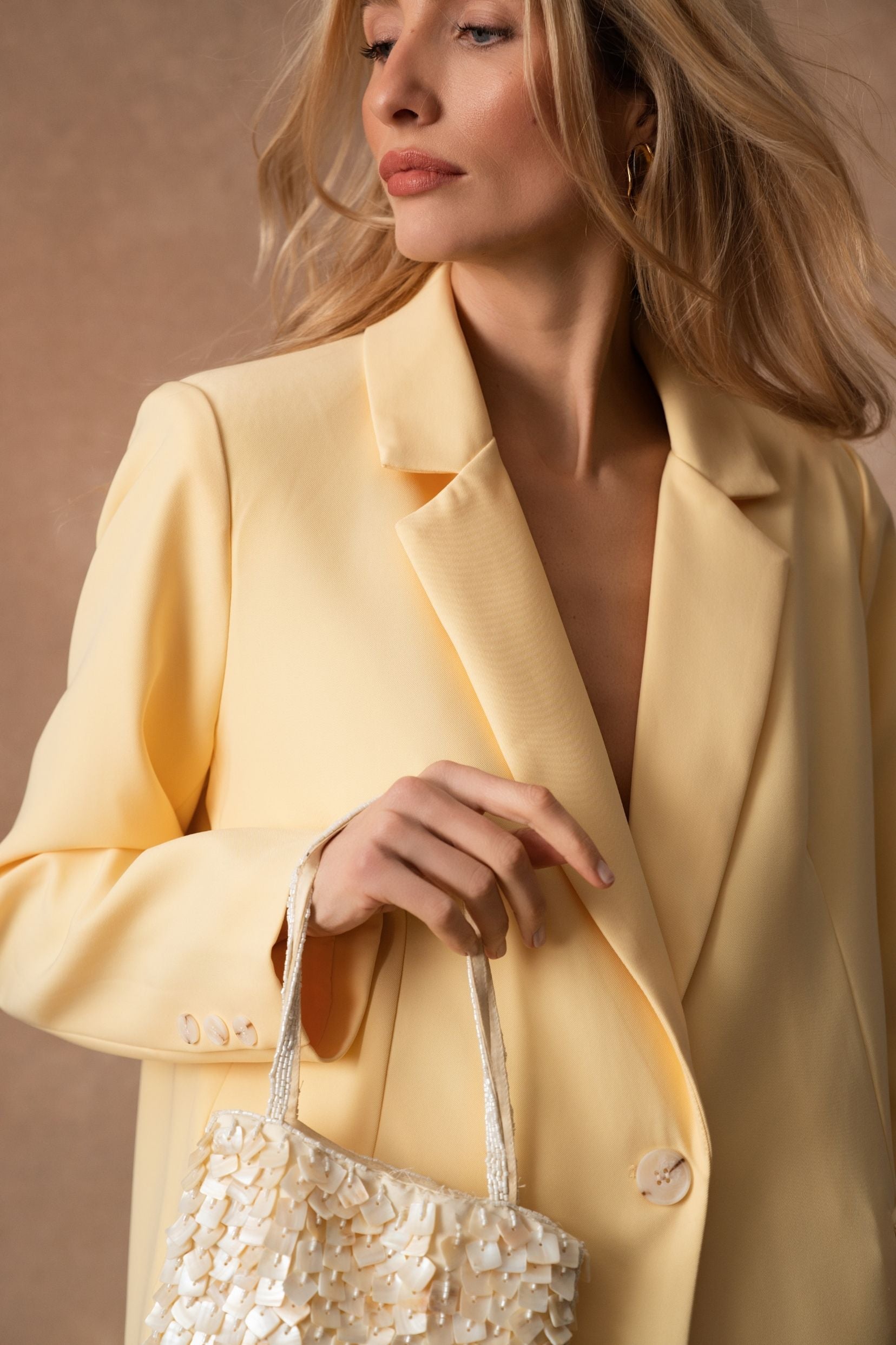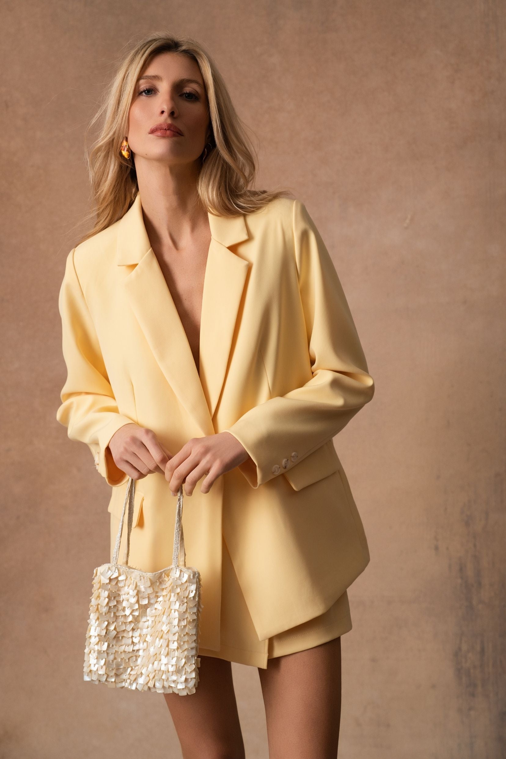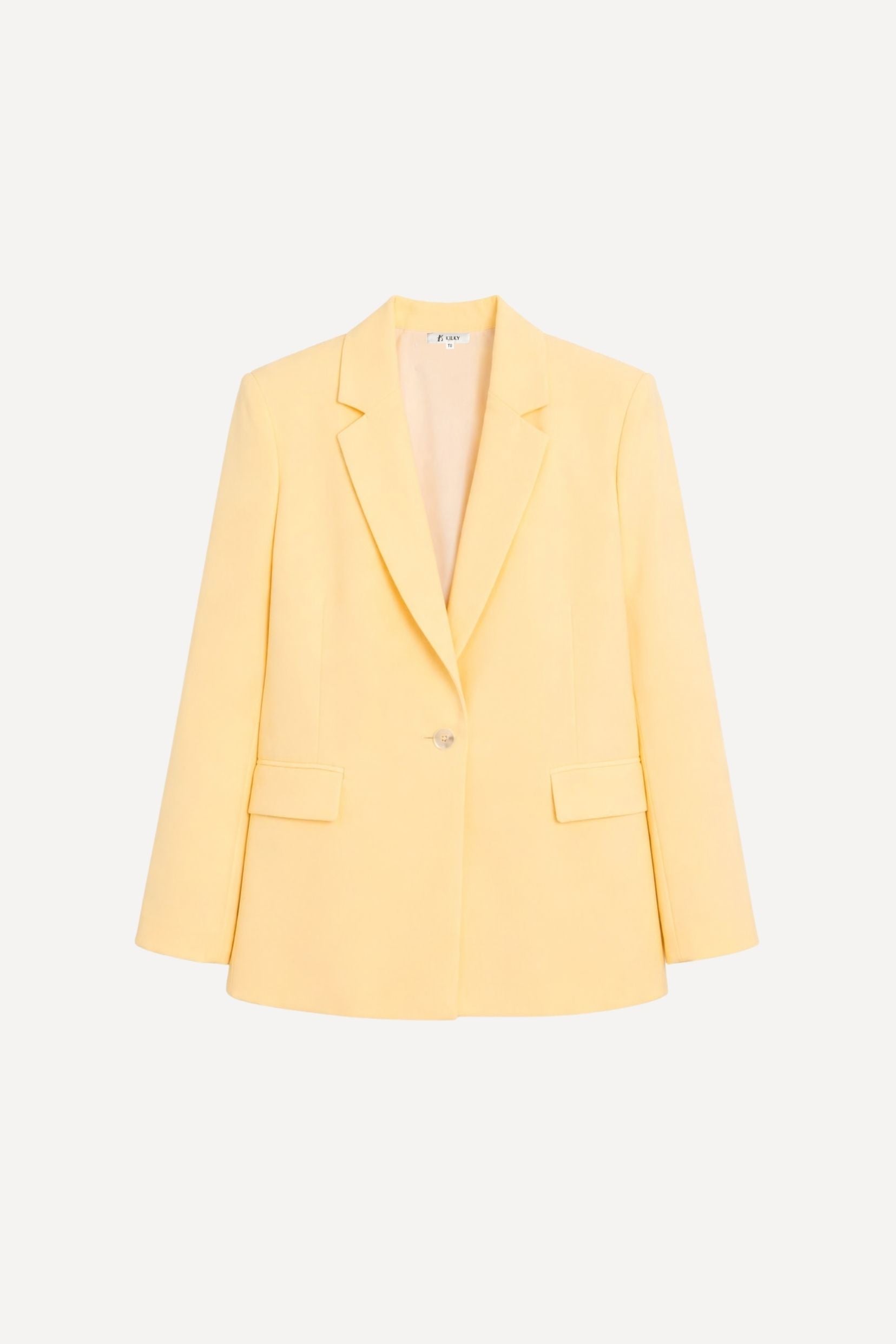 Wendy, la veste qui traverse les saisons avec une élégance naturelle, se décline désormais en jaune lumineux. Sa ligne de costume, nette mais jamais stricte, structure la silhouette avec douceur. Le jaune soleil réchauffe les looks et s’accorde à tout, du plus minimal au plus habillé.