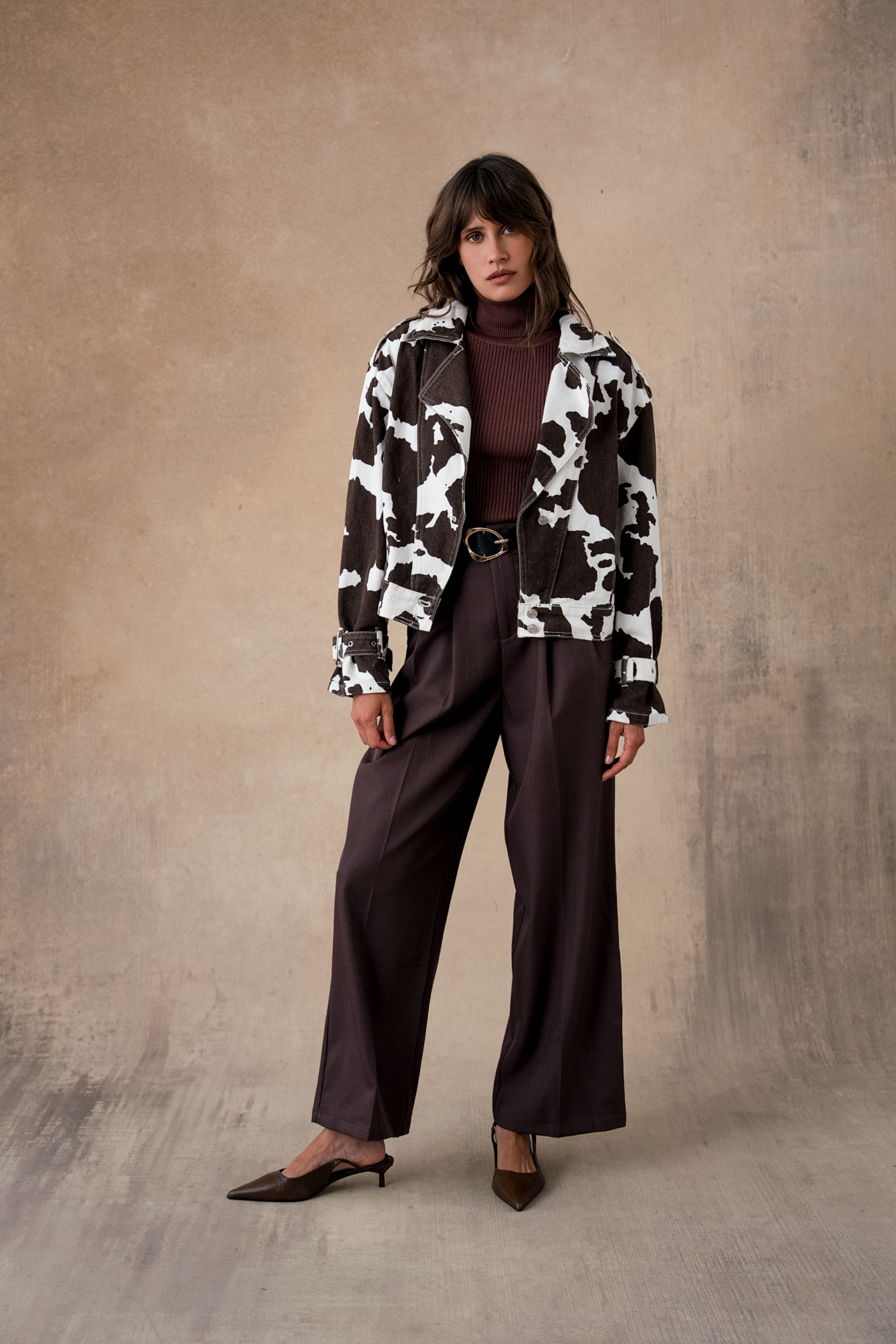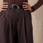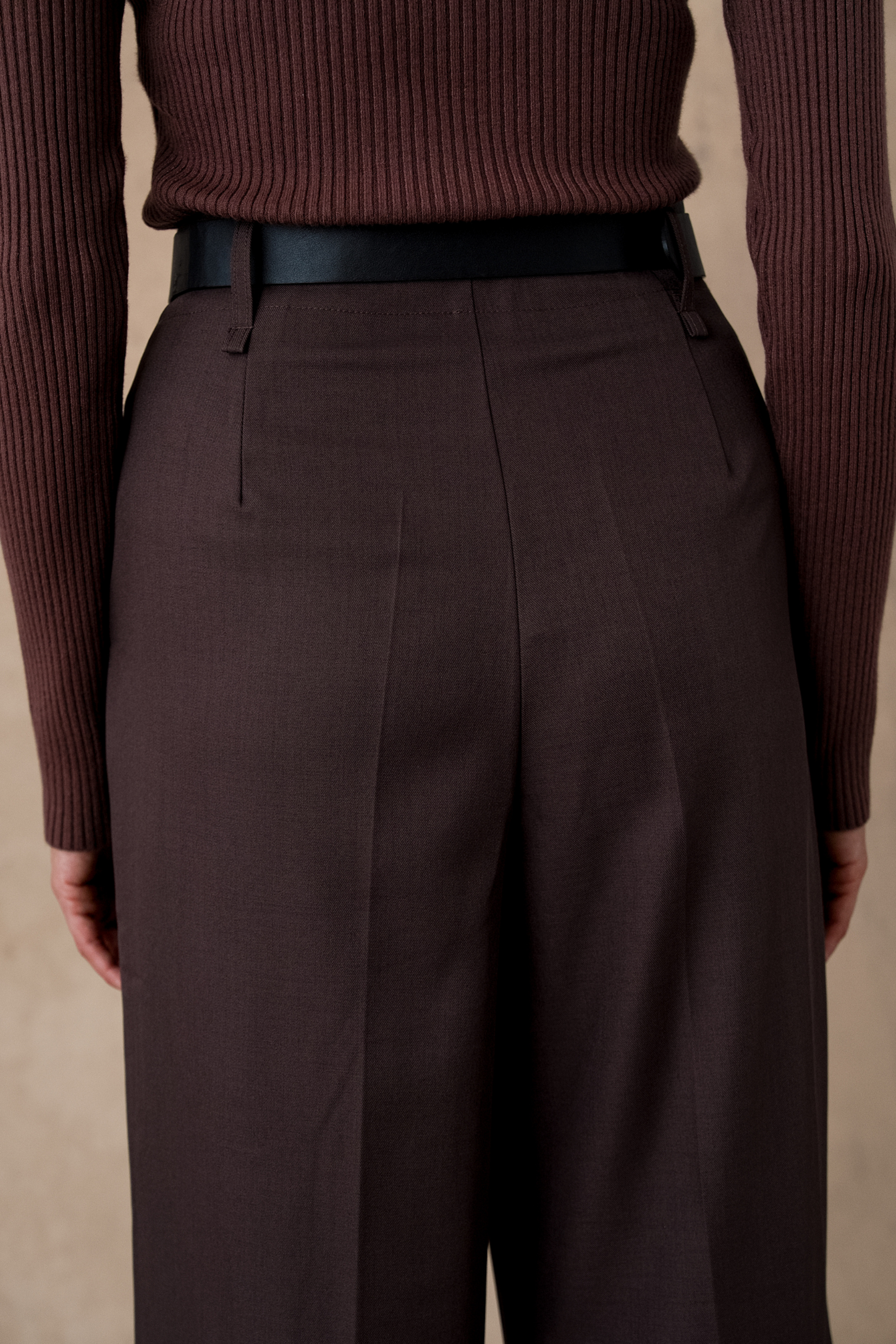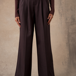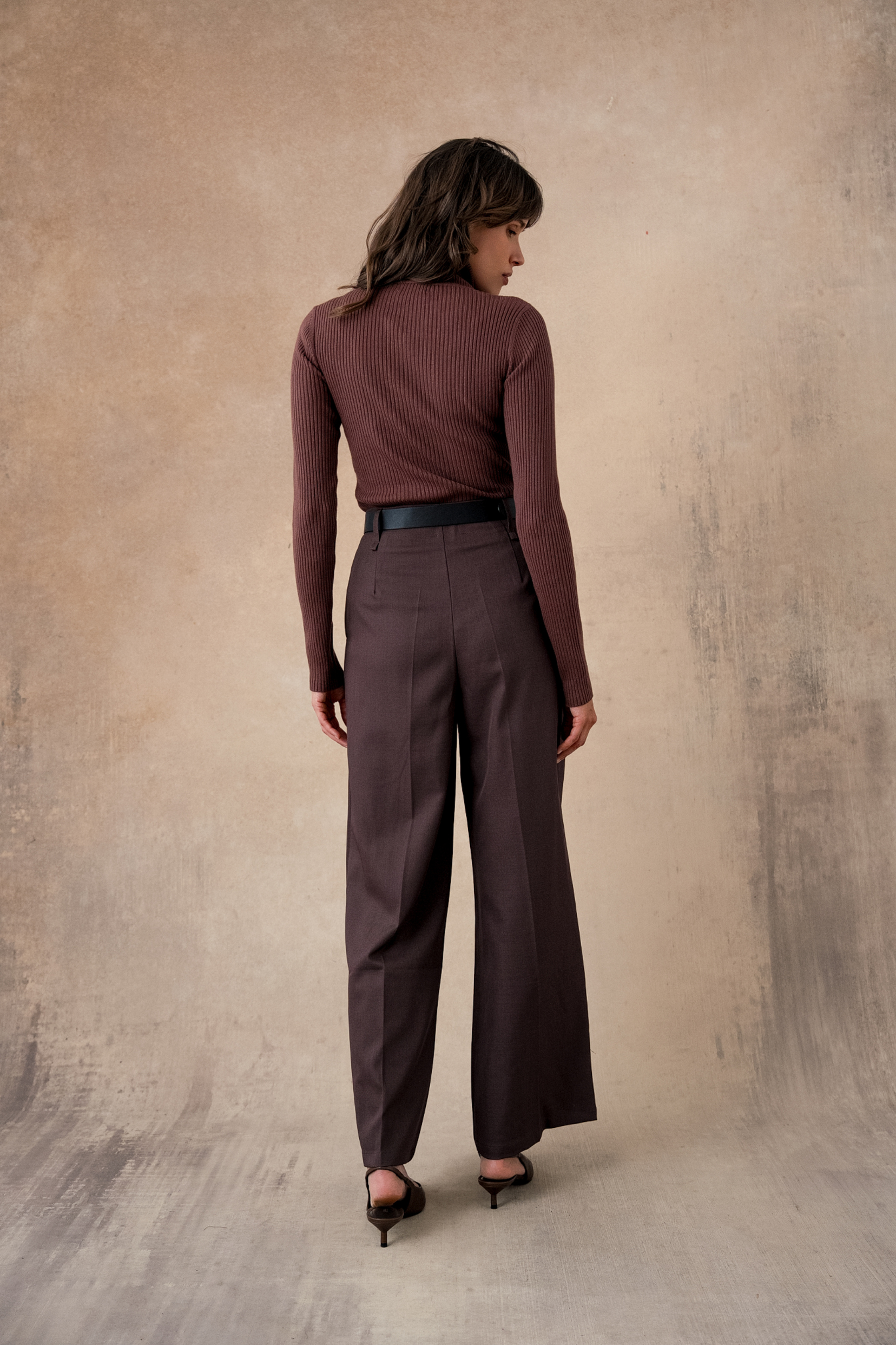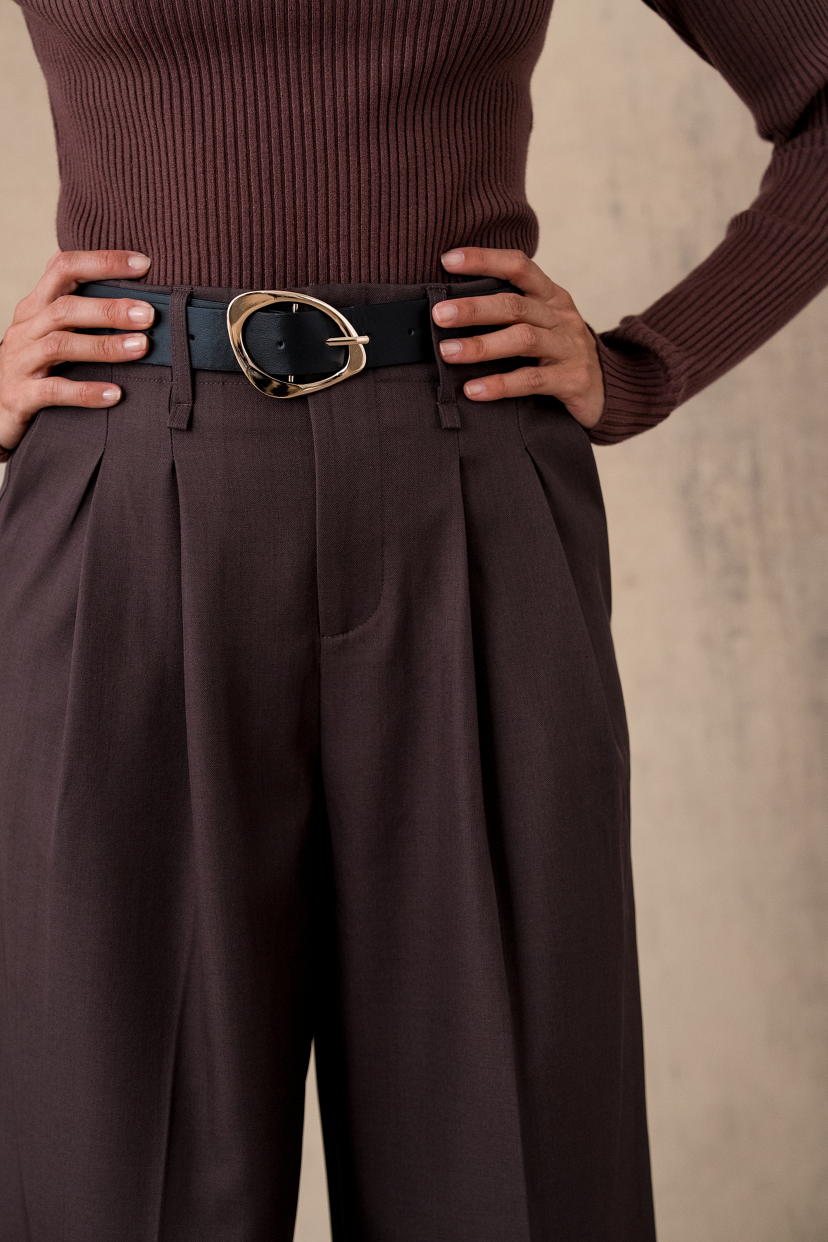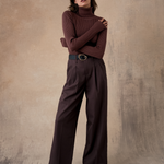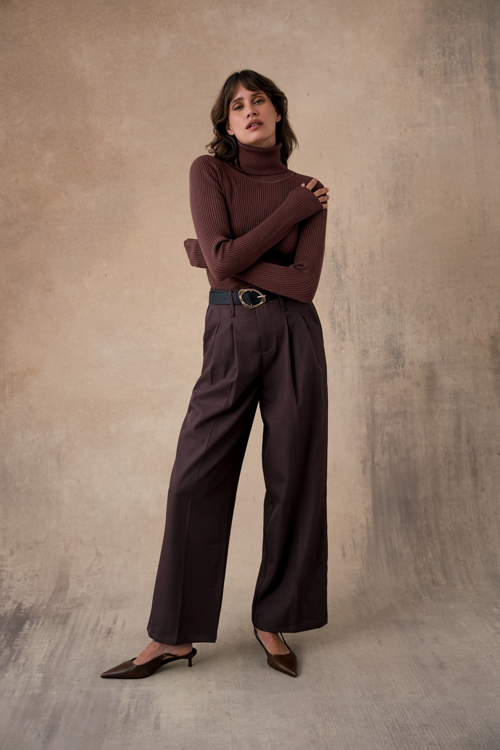 Sa coupe taille haute soulignée par une ceinture élégante affine la silhouette, tandis que ses plis marqués et sa jambe large apportent fluidité et sophistication. Dans son coloris café profond, il devient une pièce forte, facile à porter du matin au soir.