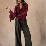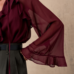 Dans sa teinte bordeaux profonde, elle insuffle un souffle de caractère à la silhouette. Son col lavallière, orné de volants délicats, attire l’œil par son détail travaillé, tandis que ses manches aériennes légèrement transparentes apportent une touche de sensualité subtile.