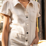 Discover our short-sleeved cotton jumpsuit Brenda, designed with a buttoned fastening and a belted waist for a perfect fit. Buttons on the ankles add a touch of originality to this versatile and fashionable model, making this piece a must-have this season.Ideal for a casual yet elegant look, this jumpsuit offers a modern and comfortable style for all occasions.