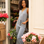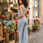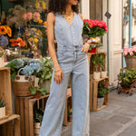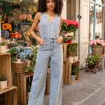 La combinaison Inaé revisite le denim avec une touche féminine et contemporaine. Avec sa coupe évasée et ses manches courtes, elle dessine une silhouette fluide et flatteuse, tout en conservant l’esprit pratique du jean. Sa poche plaquée sur le devant apporte un détail utilitaire, rehaussé par une patte de boutonnage aux boutons argentés qui illumine l’ensemble. Facile à accessoiriser, elle s’impose comme une pièce forte du quotidien, entre décontraction et caractère.