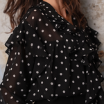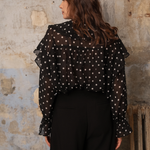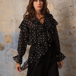 Its slightly sheer fabric plays with transparency and elegantly reveals the skin. Delicate ruffles on the shoulder and collar add a romantic touch, while its flowing and stretchy material follows movements with lightness.