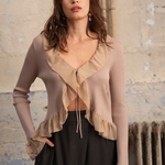 Its slightly sheer fabric plays with transparency and elegantly reveals the skin. Delicate ruffles on the shoulder and collar add a romantic touch, while its flowing and stretchy material follows movements with lightness.