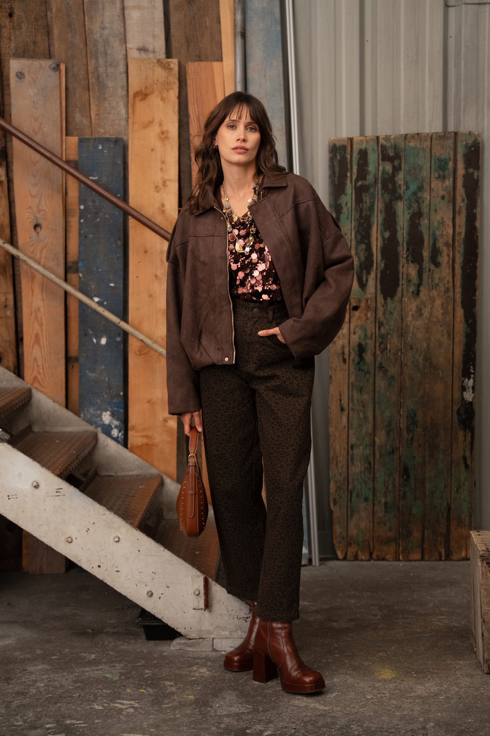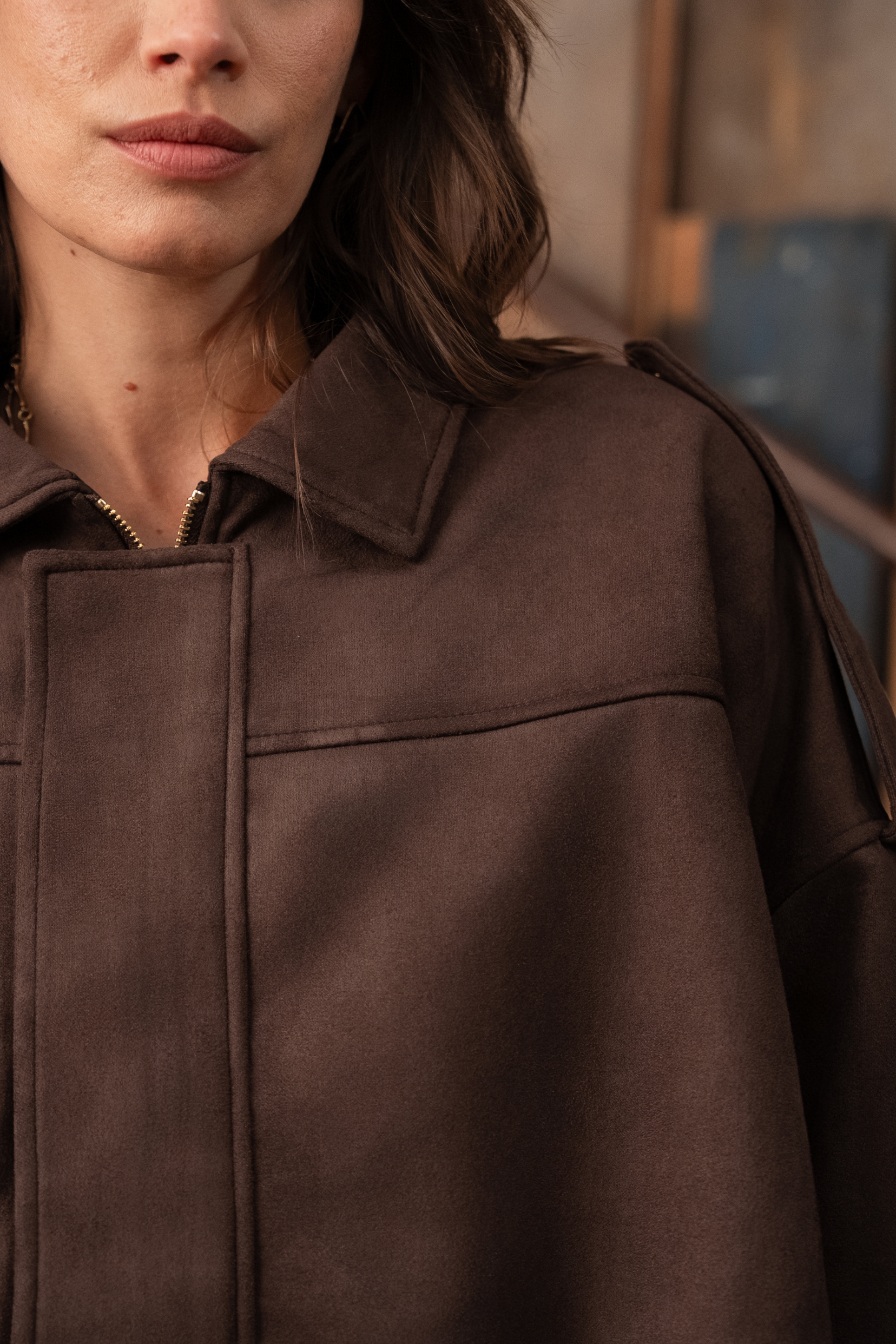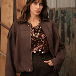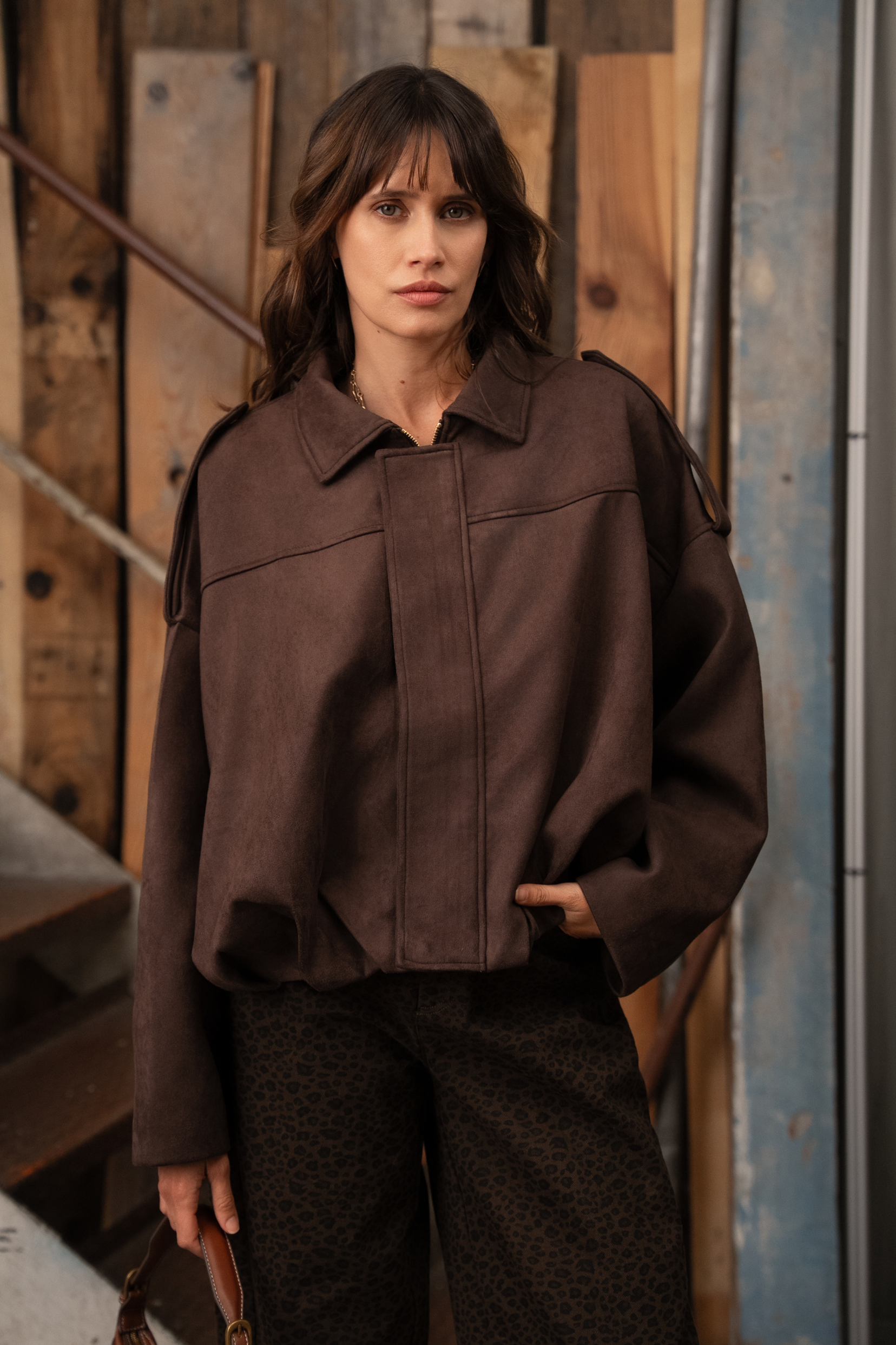 Inspired by the denim jacket, its slightly oversized cut and large patch pockets give it a casual and modern look. In its deep brown color, it becomes the ideal piece to layer: over a flowing dress to break the codes, or with printed trousers for a confident look.