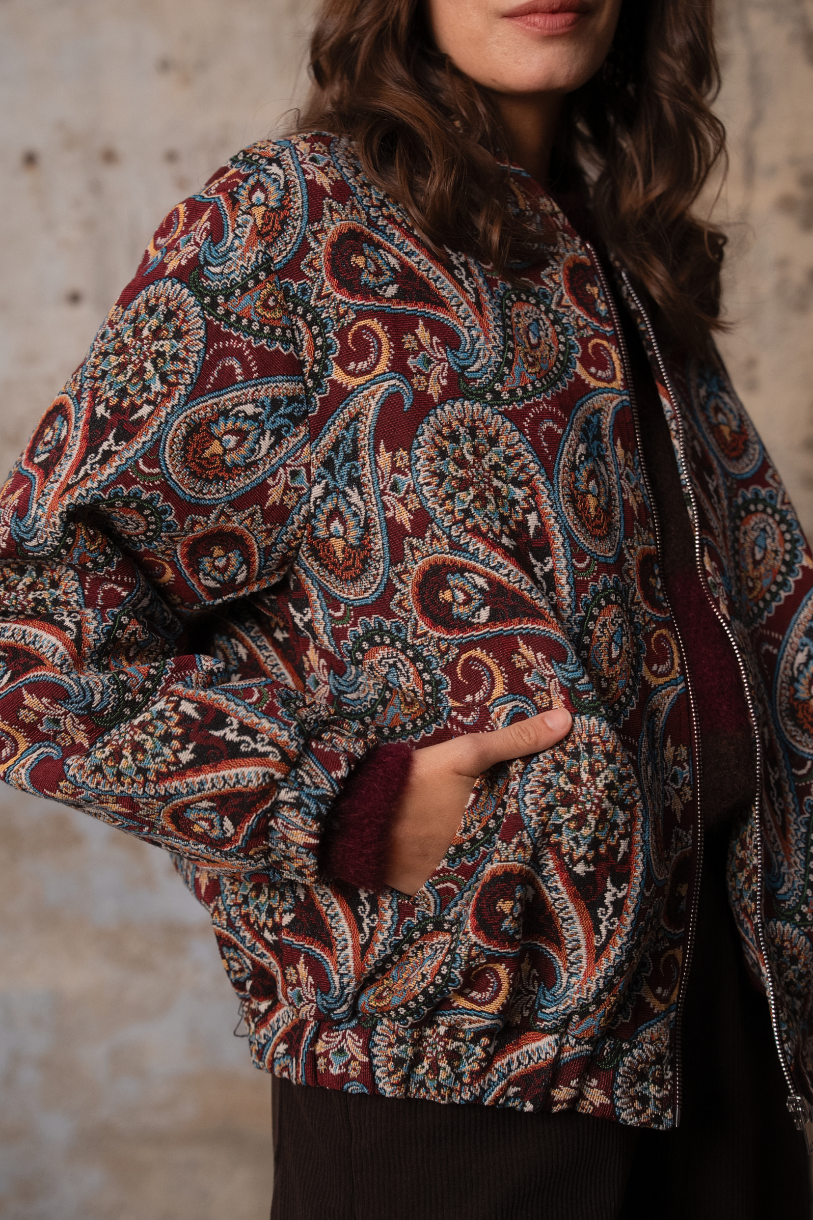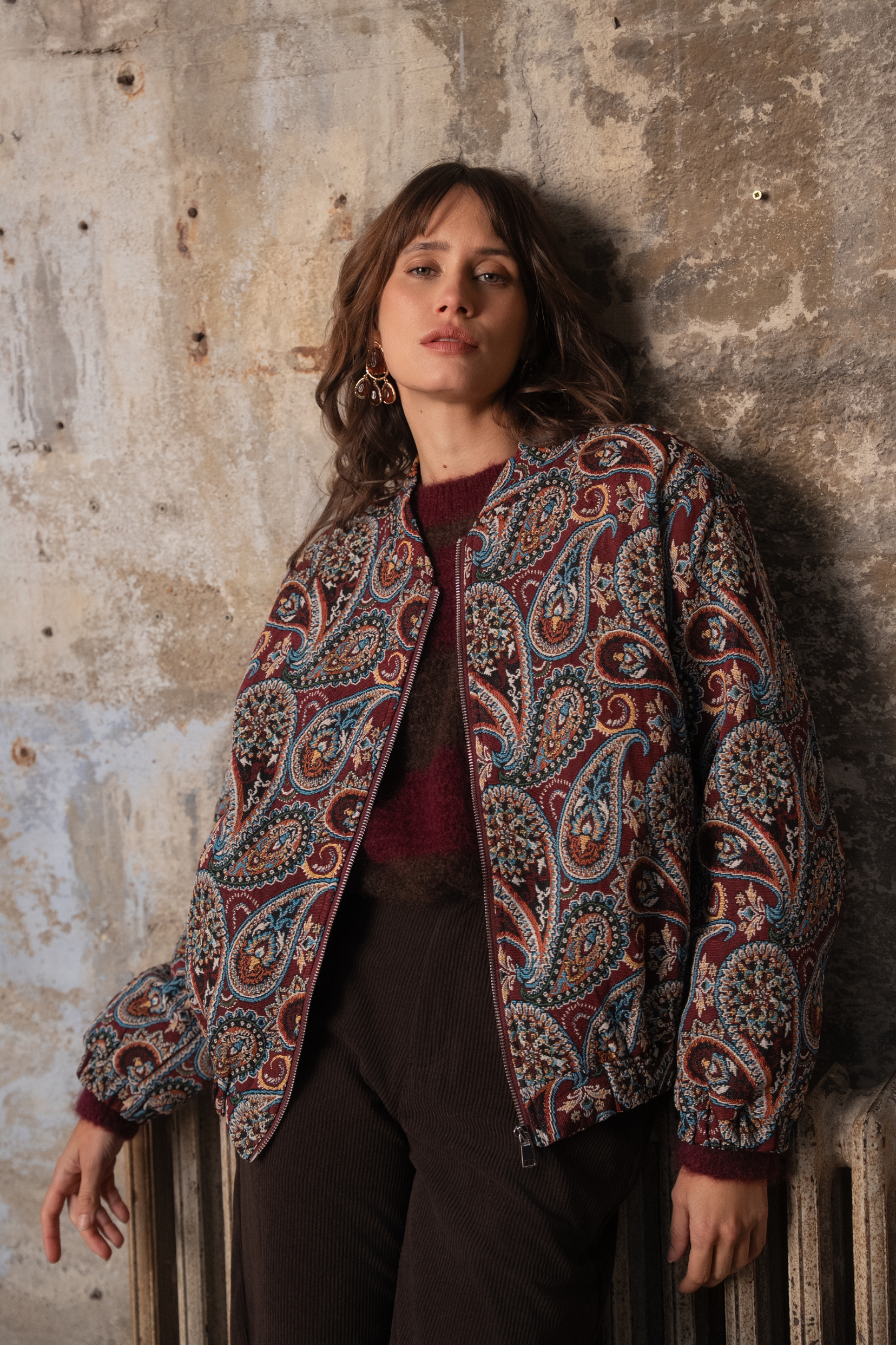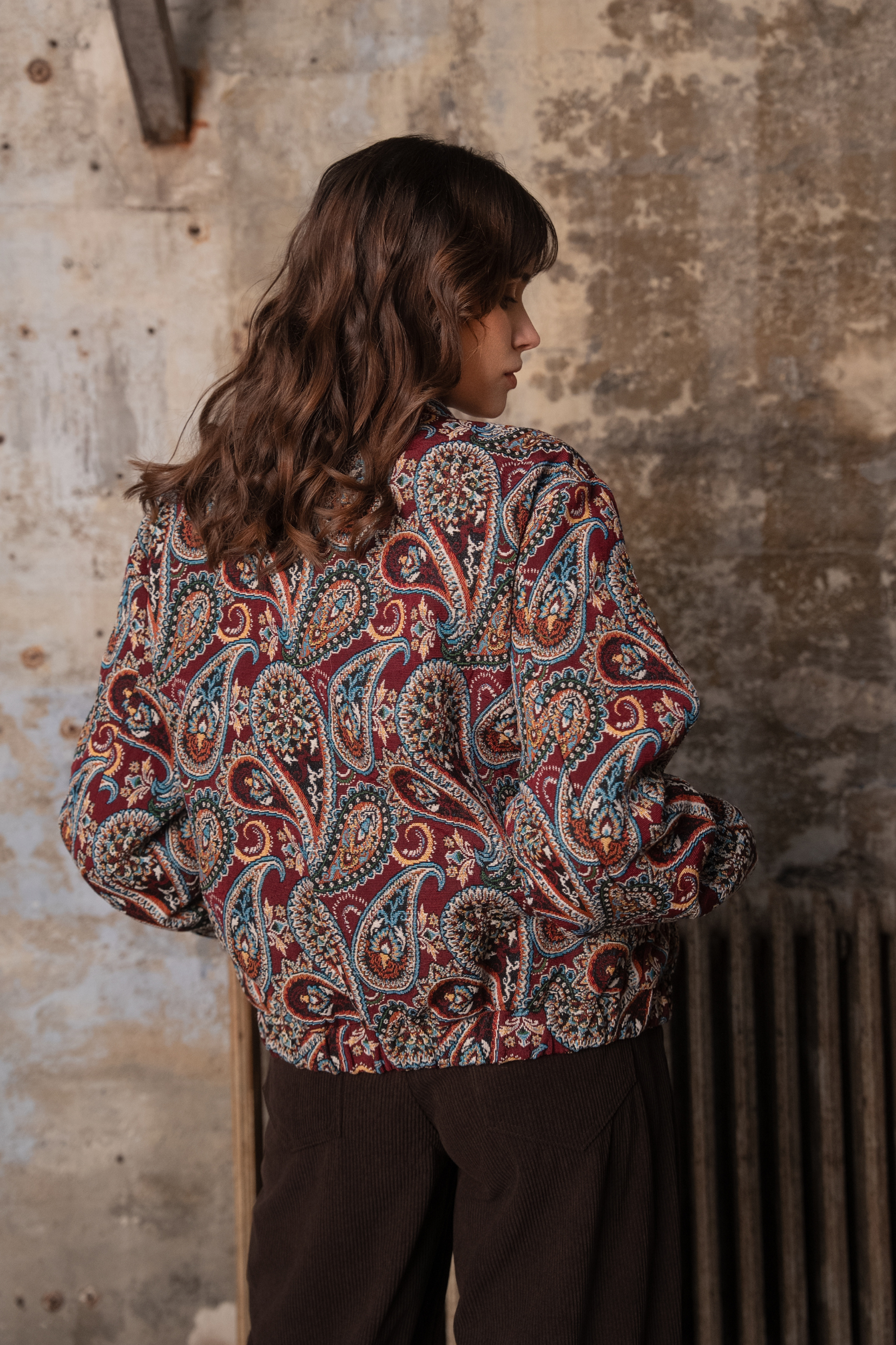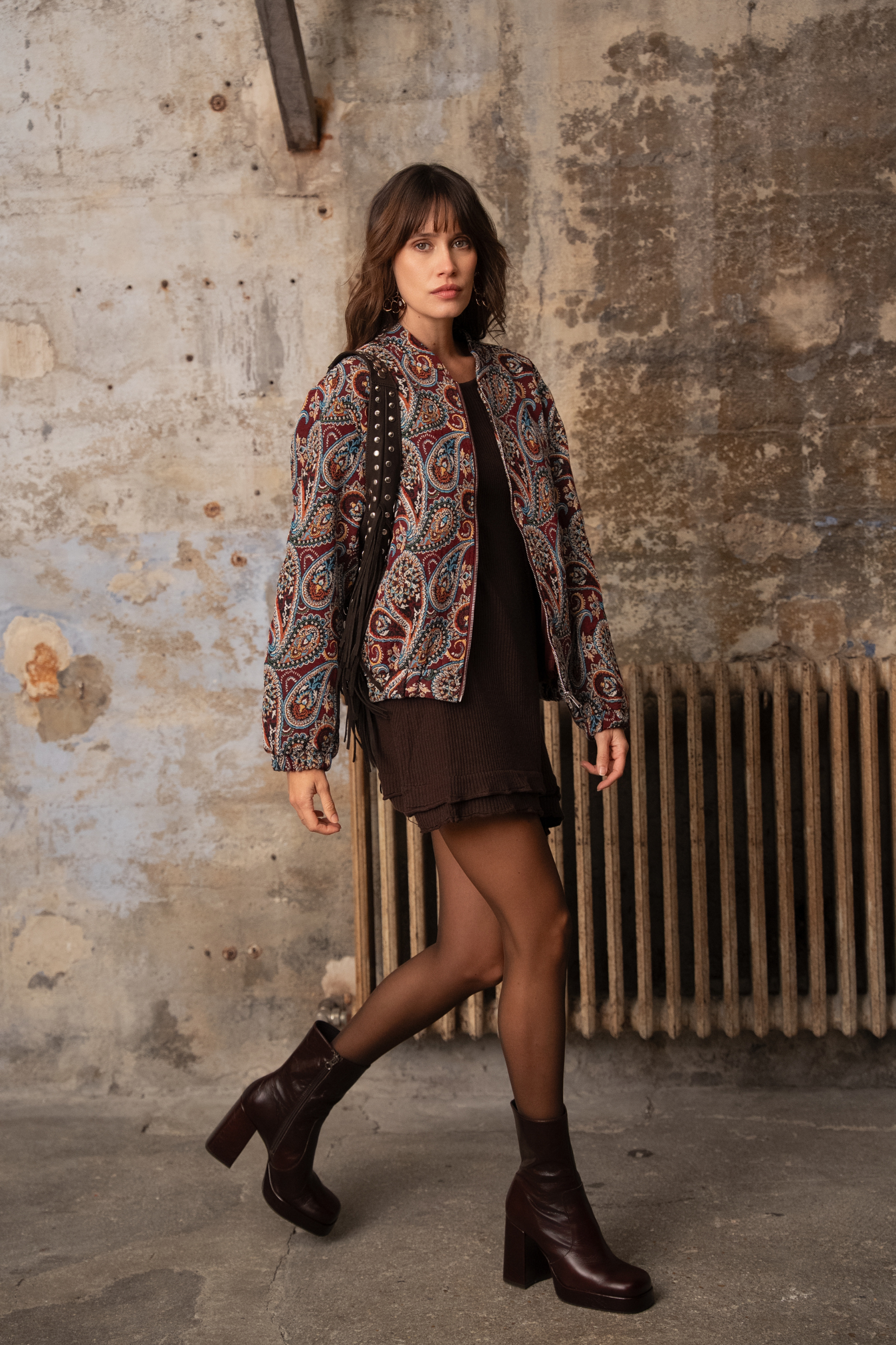 Inspired by the denim jacket, its slightly oversized cut and large patch pockets give it a casual and modern look. In its deep brown color, it becomes the ideal piece to layer: over a flowing dress to break the codes, or with printed trousers for a confident look.