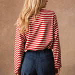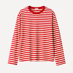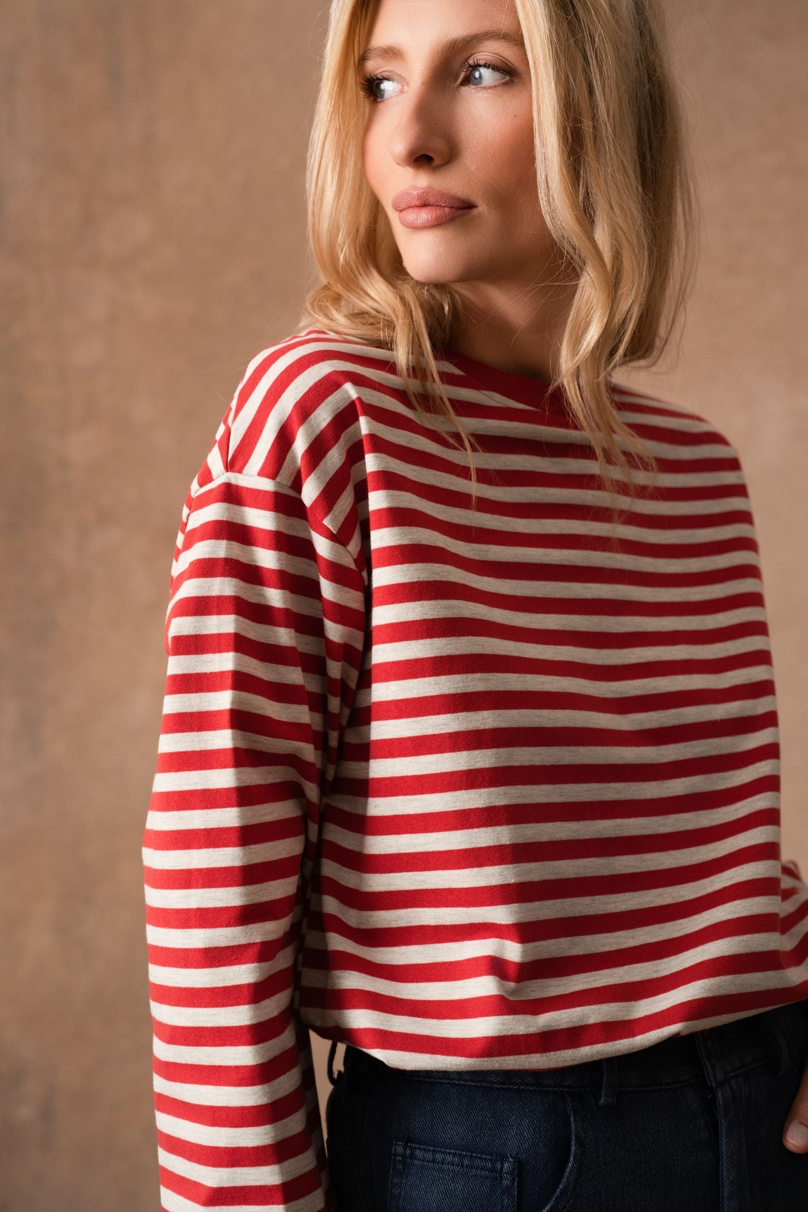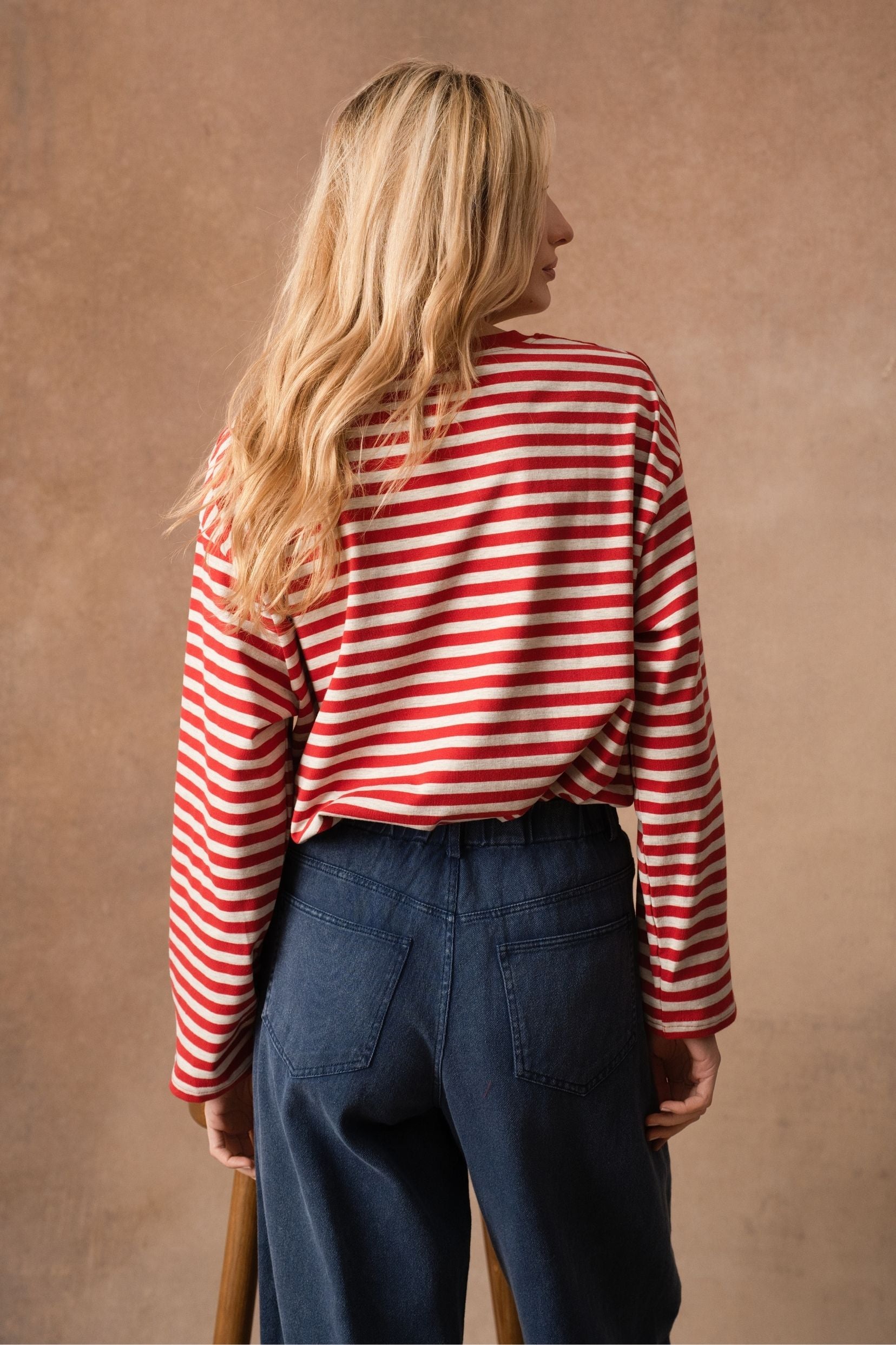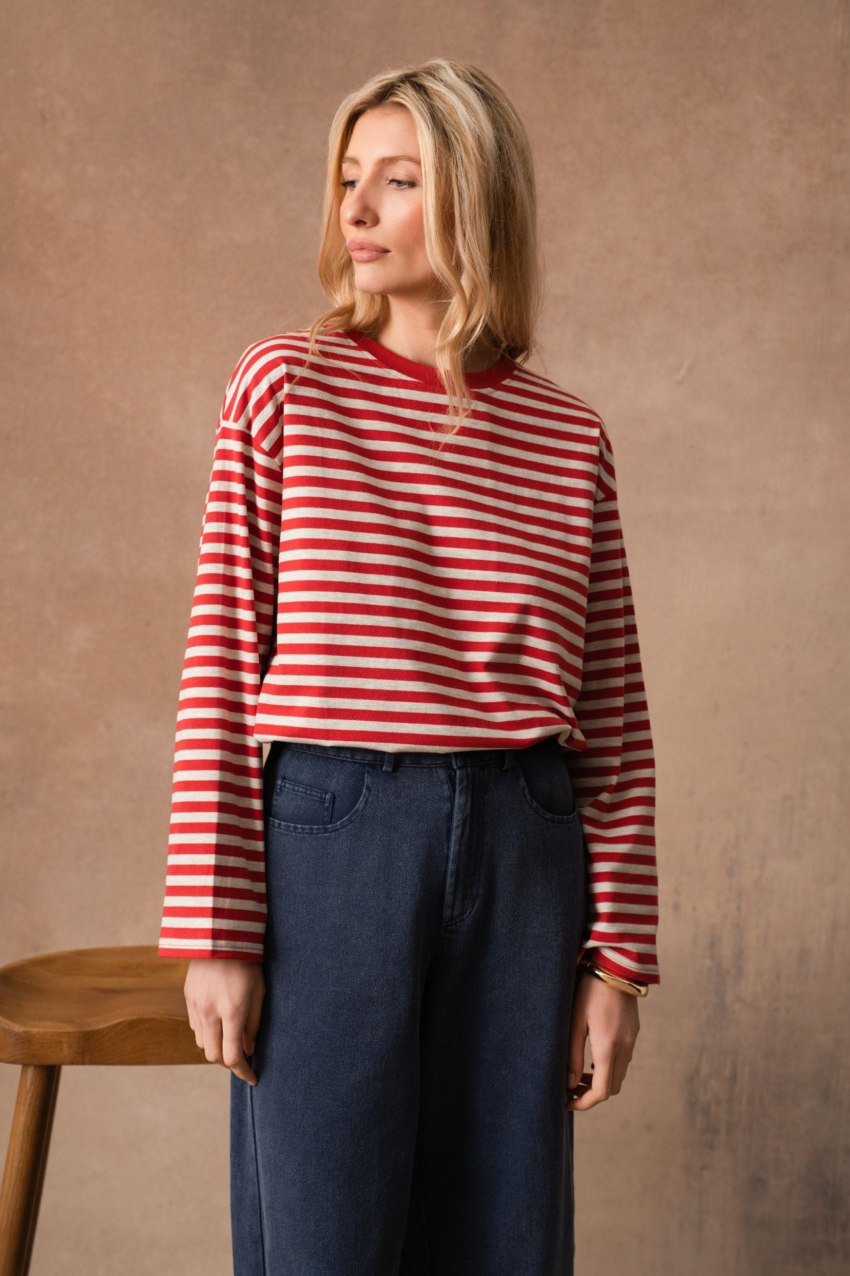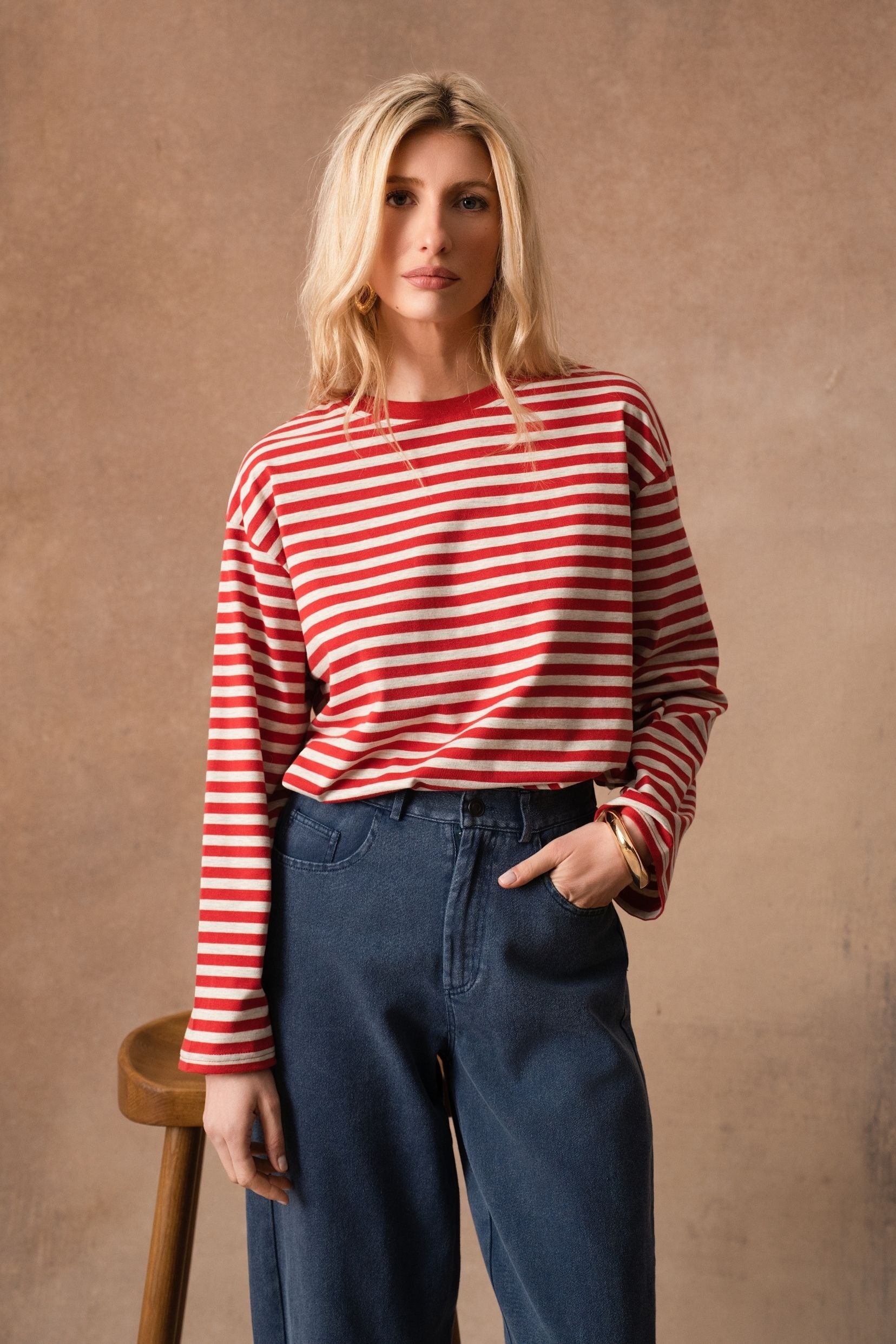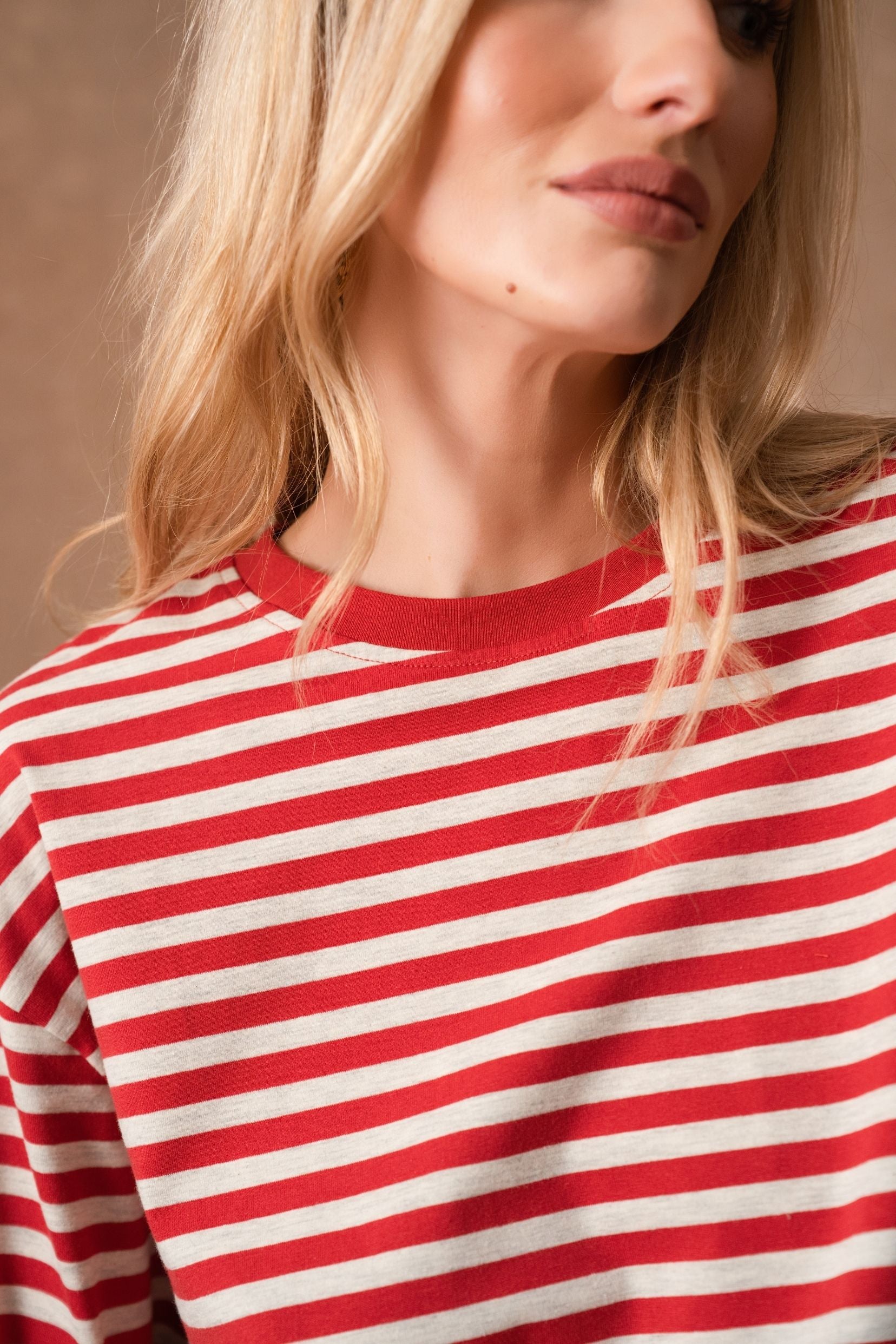 Le t-shirt Arianne mêle subtilement les nuances de rouge et de gris. Son jeu de rayures apporte juste ce qu’il faut de caractère, tandis que sa coupe confortable le rend aussi agréable à porter qu’à regarder.
