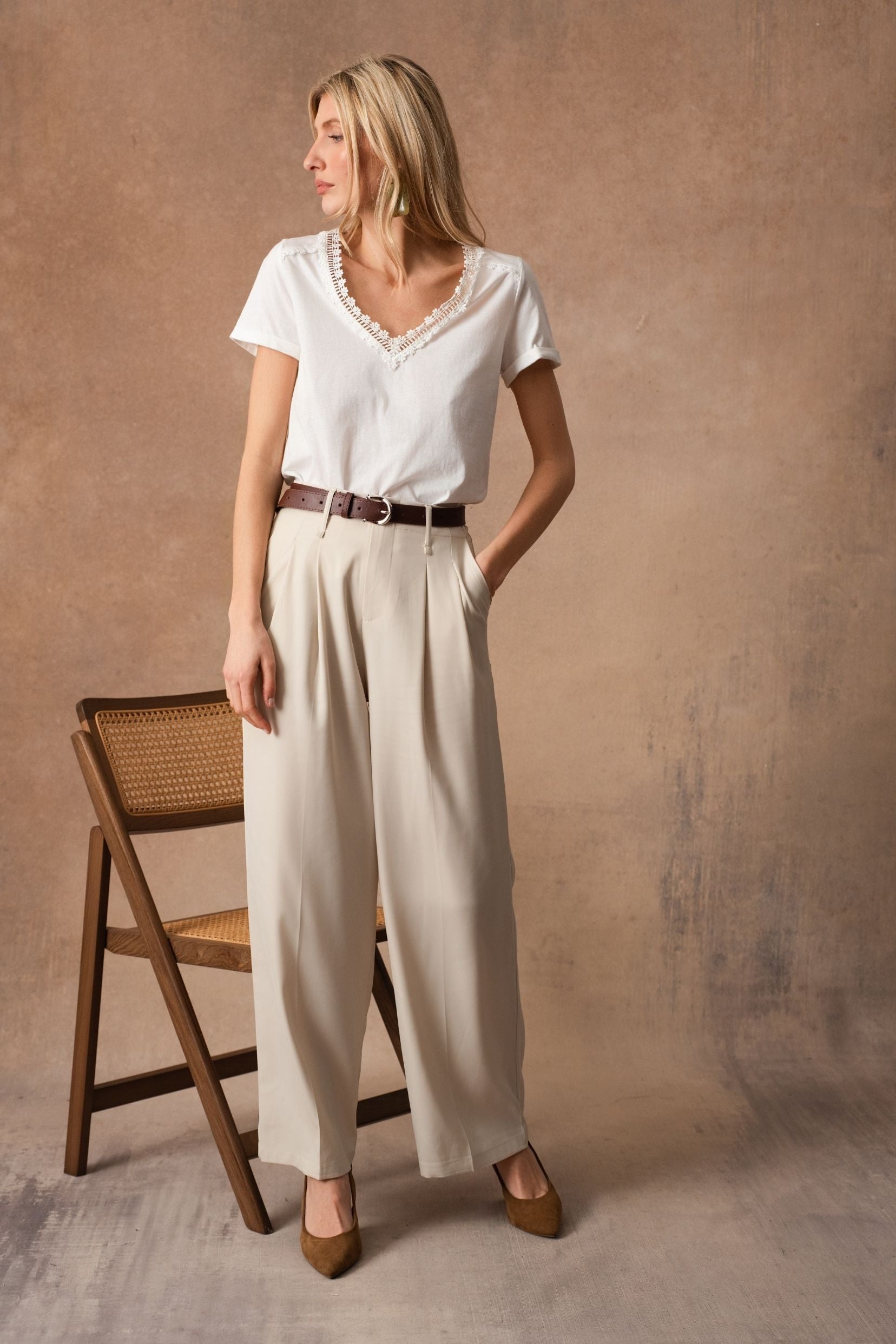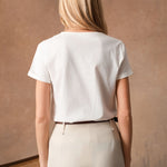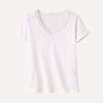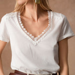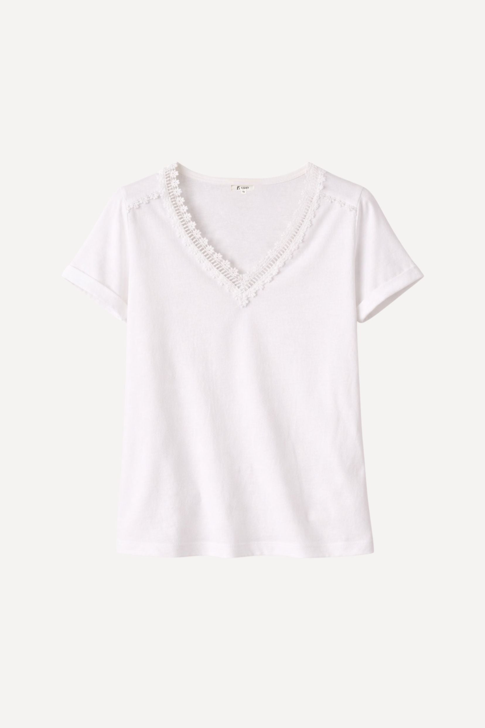 De couleur blanche, ce T-shirt à col V séduit par ses fines broderies qui insufflent une note délicate de féminité et d’élégance.