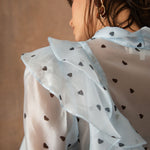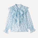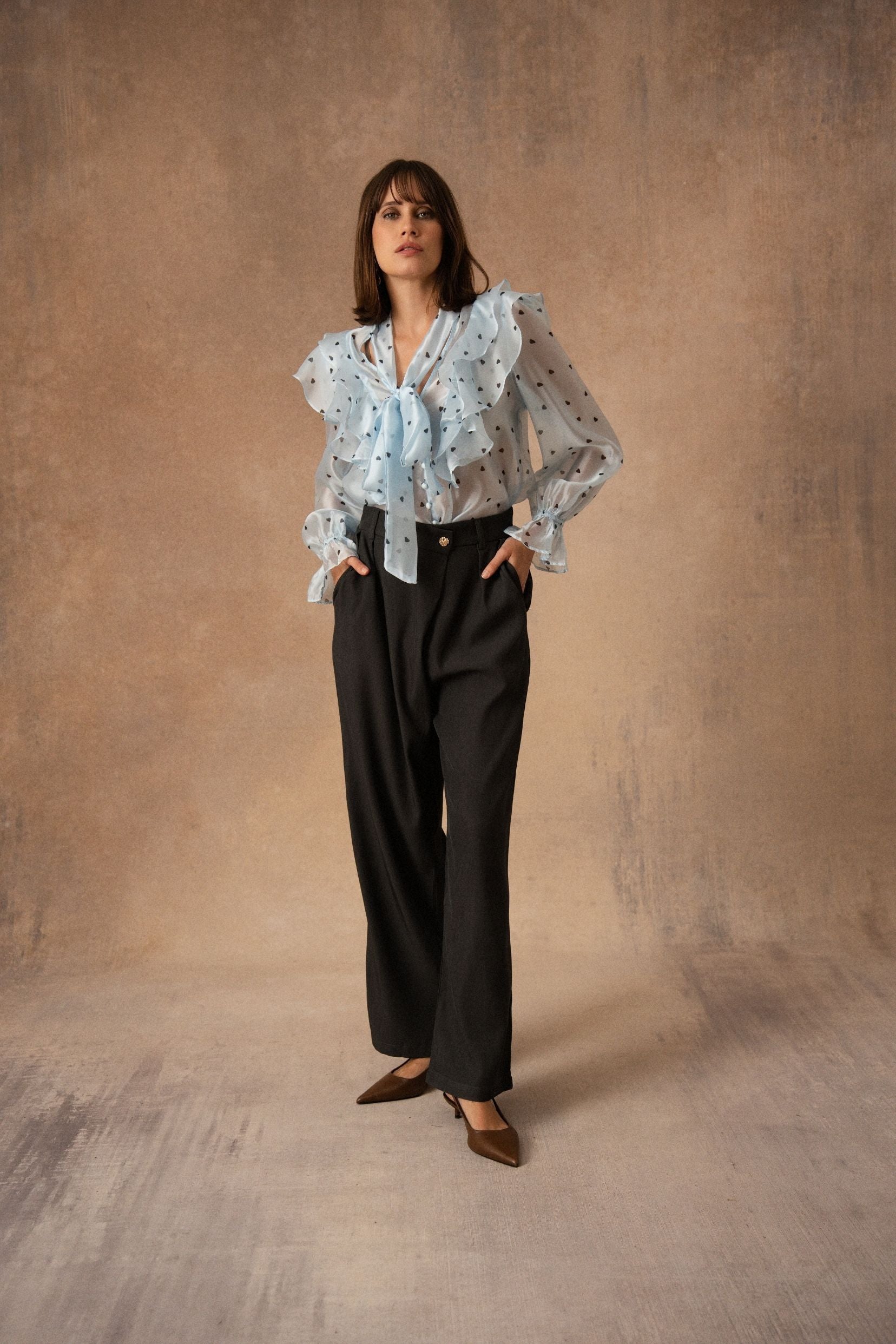 Son plastron orné de volants en cascade et son col montant froncé à lien apportent du caractère à la silhouette. Les poignets élastiqués, subtilement volantés, structurent les manches tout en légèreté.