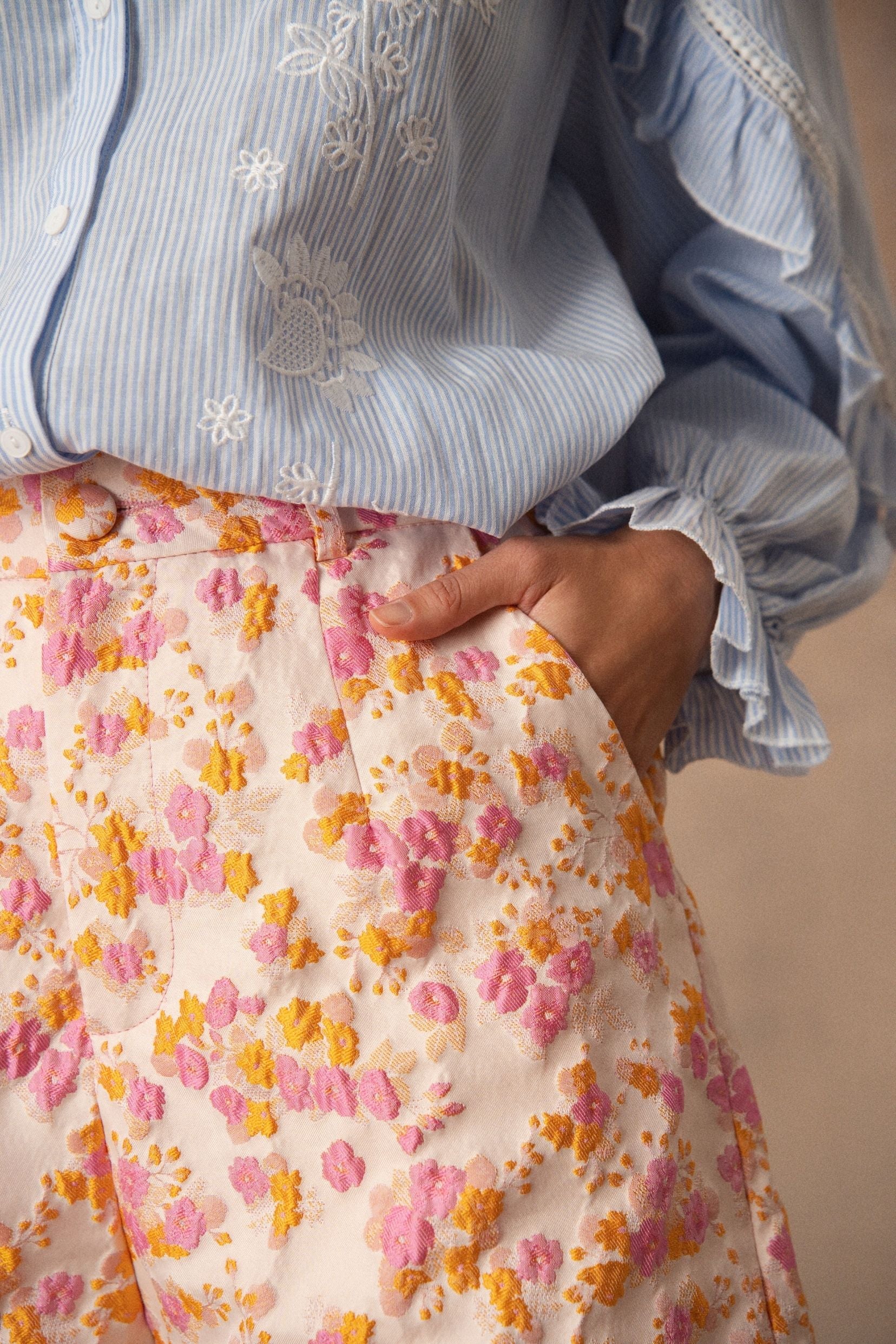Sa coupe taille haute, légèrement évasée, allonge la silhouette tout en conservant une allure féminine et décontractée. Les plis à l’avant structurent la ligne et apportent ce petit relief qui fait toute la différence, tandis que la matière accompagne le mouvement avec douceur.