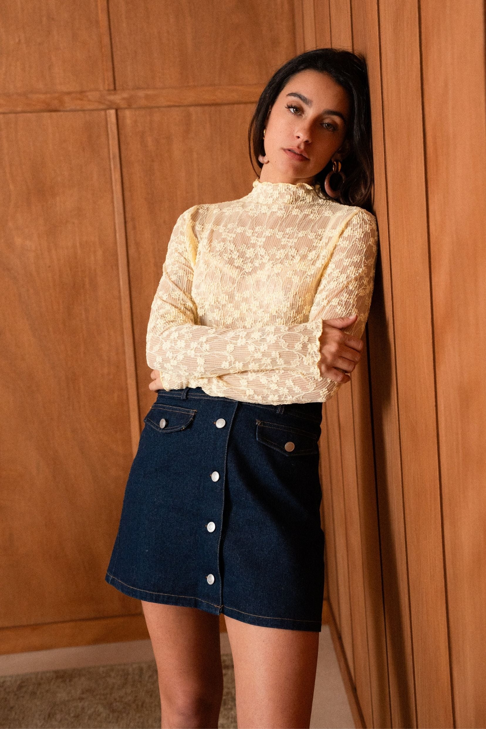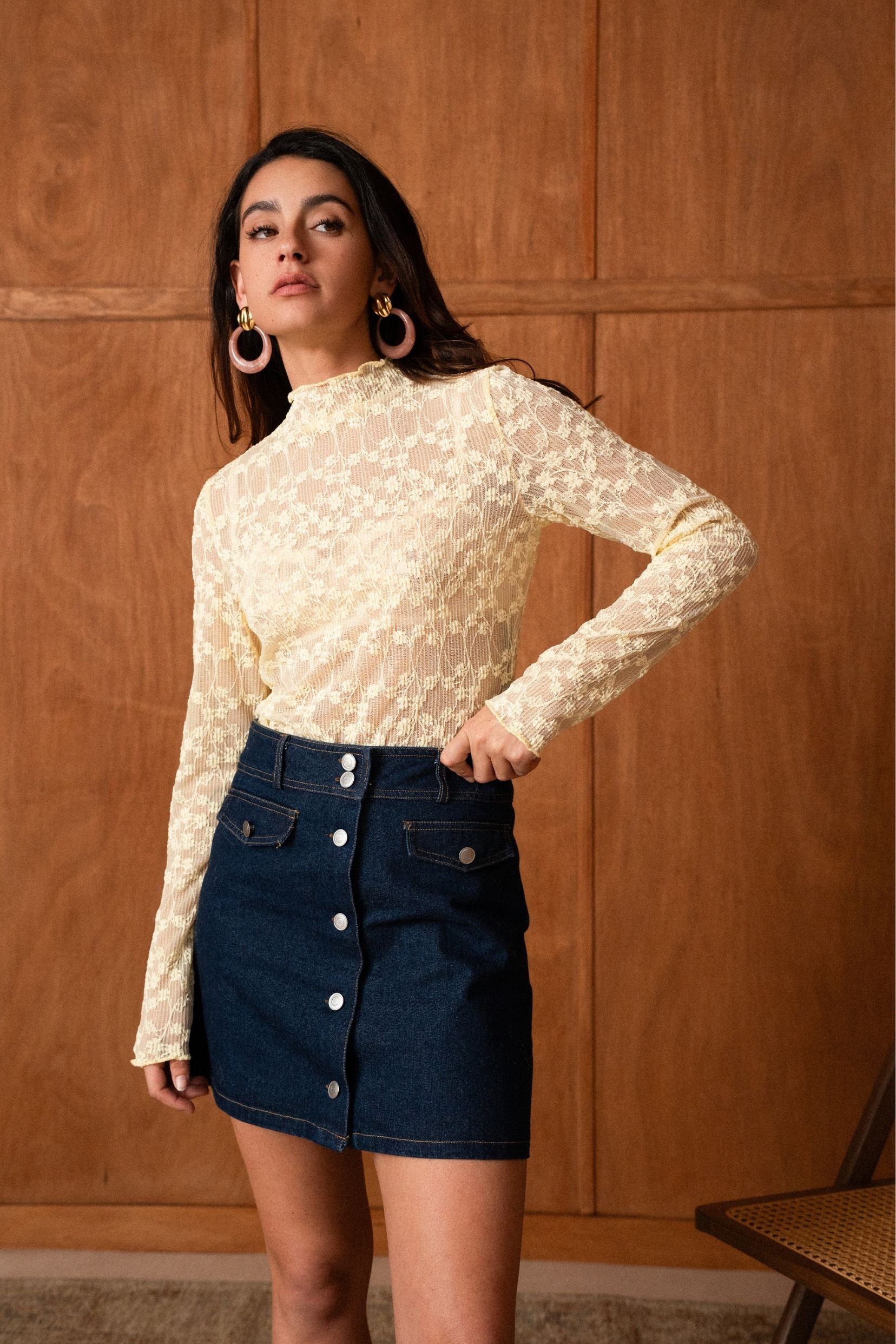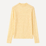 Its ribbed knit slims the silhouette while its turtleneck gently envelops, making it the ideal ally for cool days. In its deep chocolate color, it can be worn under a structured jacket for a city look, or worn alone with jeans for a minimalist and chic look.