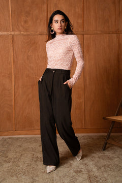 Its ribbed knit slims the silhouette while its turtleneck gently envelops, making it the ideal ally for cool days. In its deep chocolate color, it can be worn under a structured jacket for a city look, or worn alone with jeans for a minimalist and chic look.