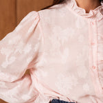 Son rose poudré illumine la silhouette avec subtilité, tandis que son jeu de transparence et de reliefs apporte une dimension aérienne à la pièce. C’est une blouse pensée pour celles qui aiment les détails délicats, sans jamais renoncer au confort.
