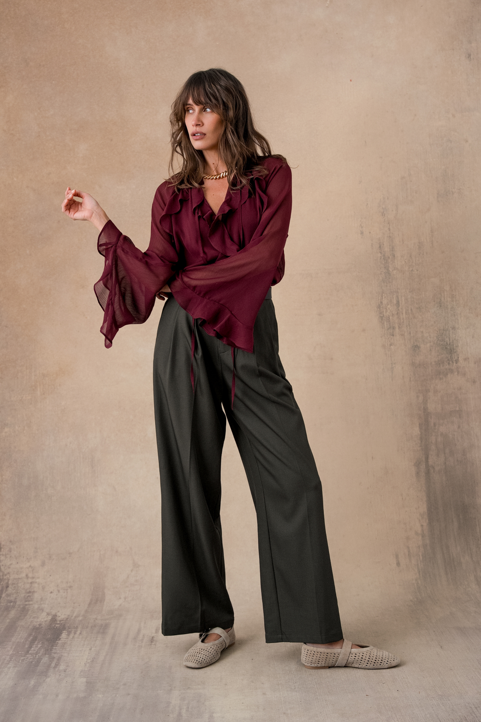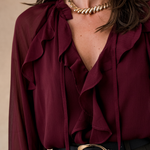Dans sa teinte bordeaux profonde, elle insuffle un souffle de caractère à la silhouette. Son col lavallière, orné de volants délicats, attire l’œil par son détail travaillé, tandis que ses manches aériennes légèrement transparentes apportent une touche de sensualité subtile.