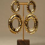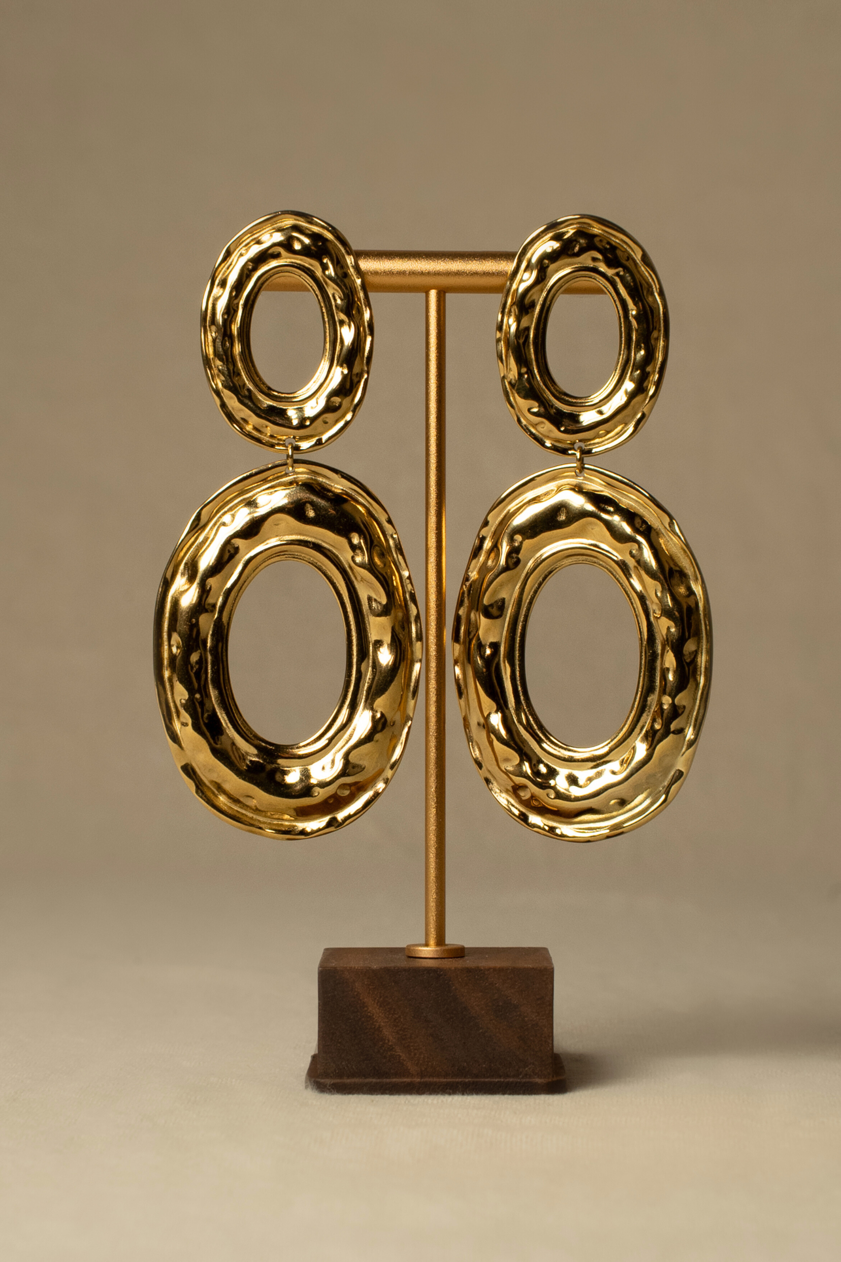 Leur forme ovale texturée, presque artisanale, capte chaque reflet pour illuminer le visage avec une élégance affirmée.