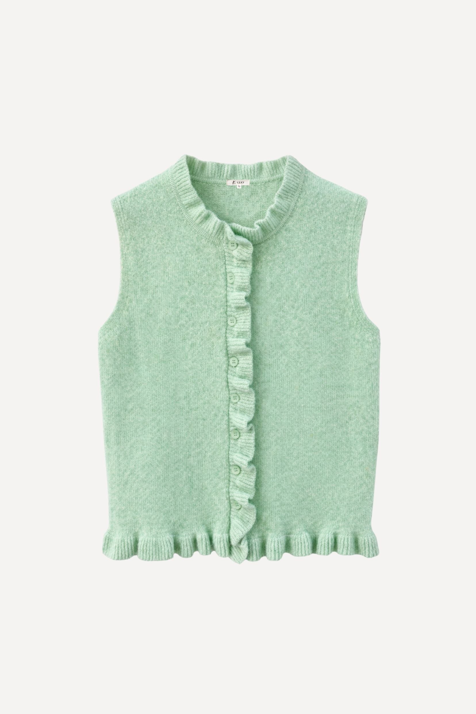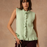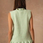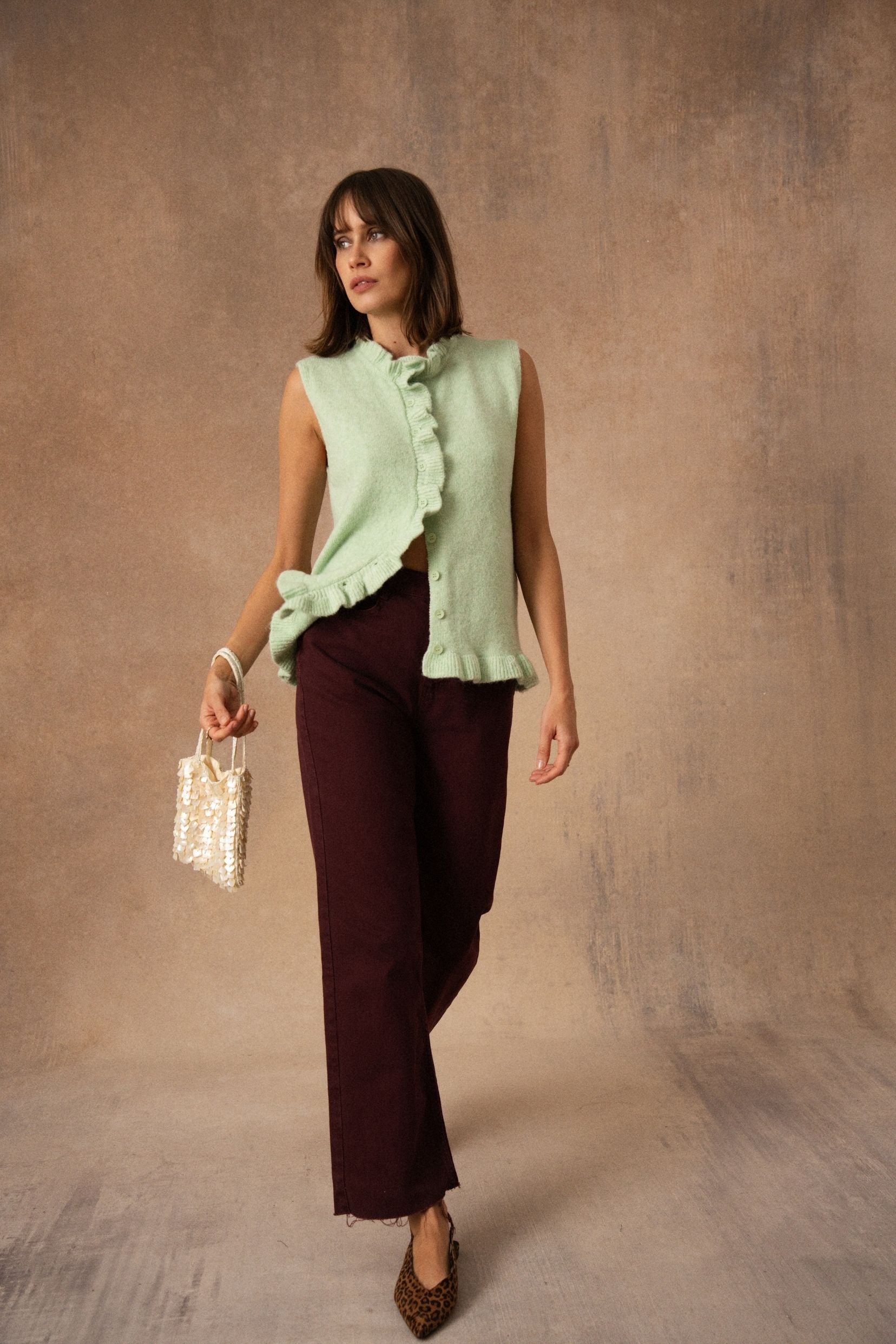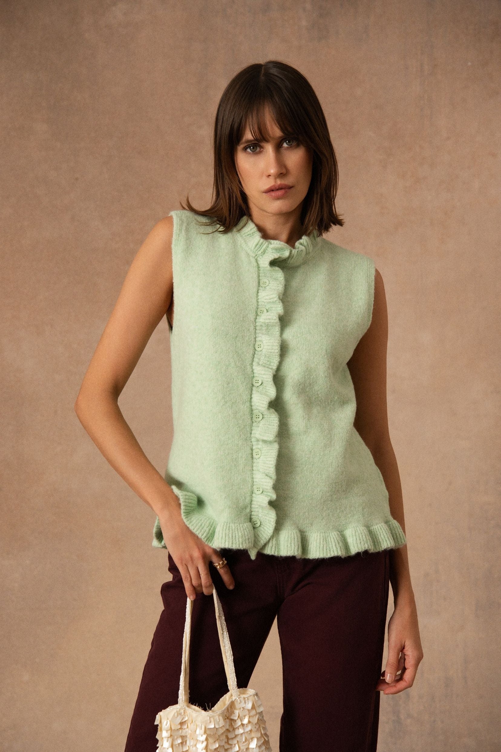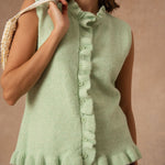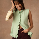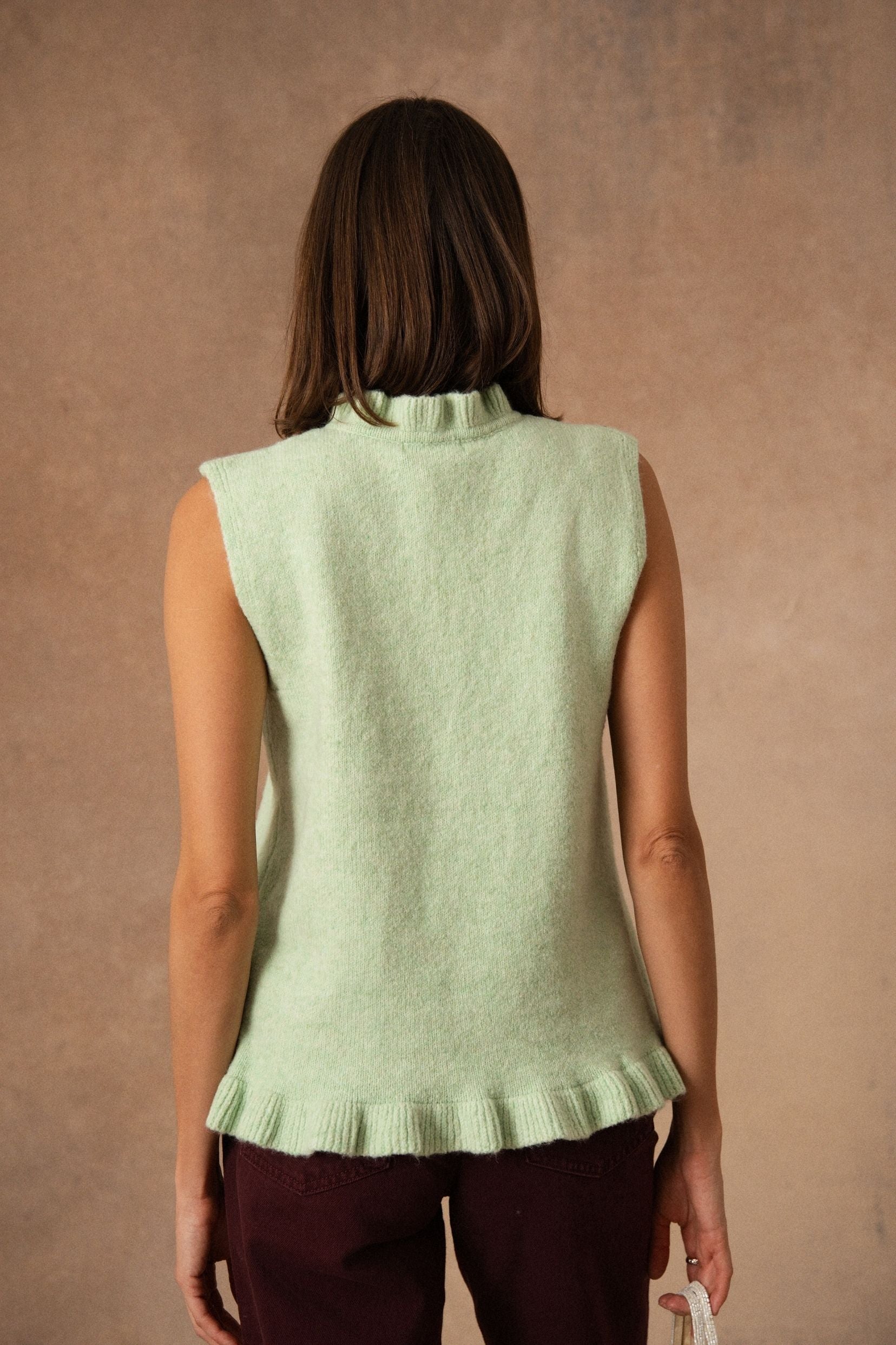 Rosina est de ces pièces qui glissent naturellement dans le vestiaire. Un cardigan sans manches, pensé pour accompagner les superpositions avec légèreté et simplicité.