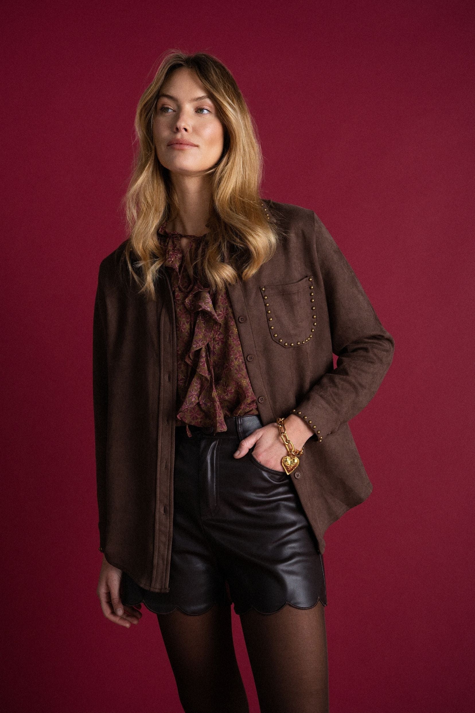 Sa couleur café, chaude et élégante, est soulignée de petits clous dorés qui bordent le col, la poche et les poignets, un détail subtil mais irrésistible. Une pièce qui revisite la chemise classique avec une touche moderne, féminine, typiquement Kilky Paris.