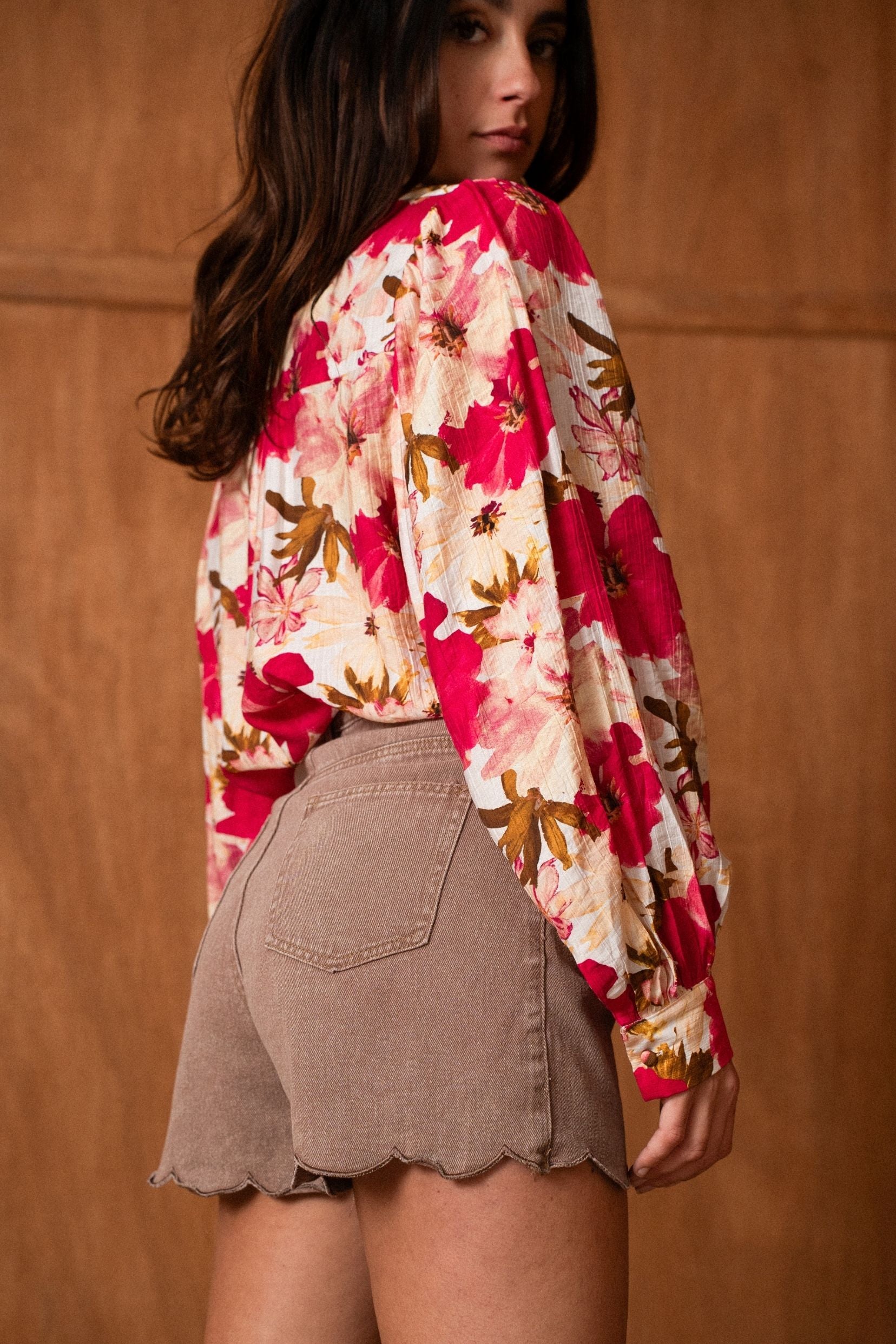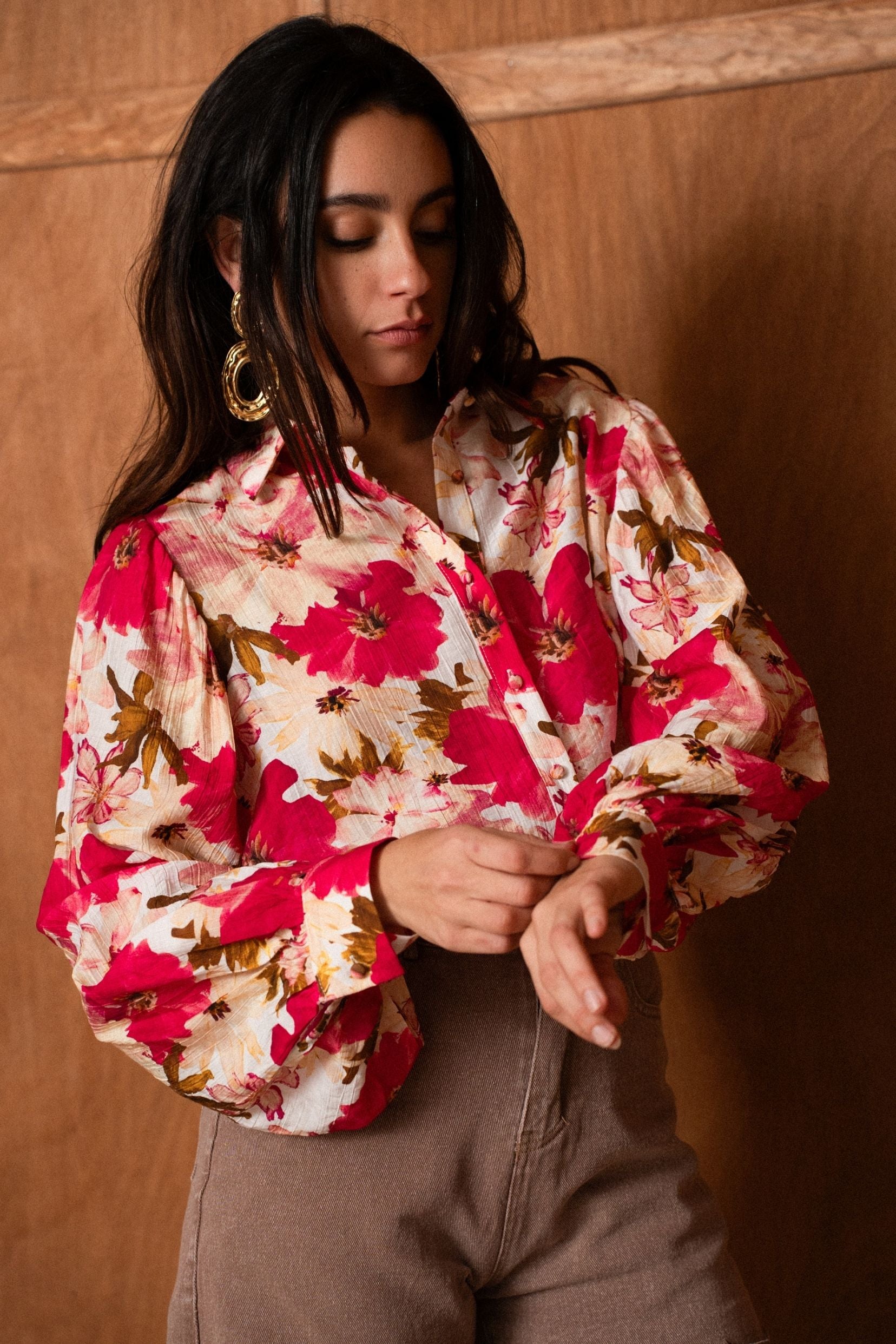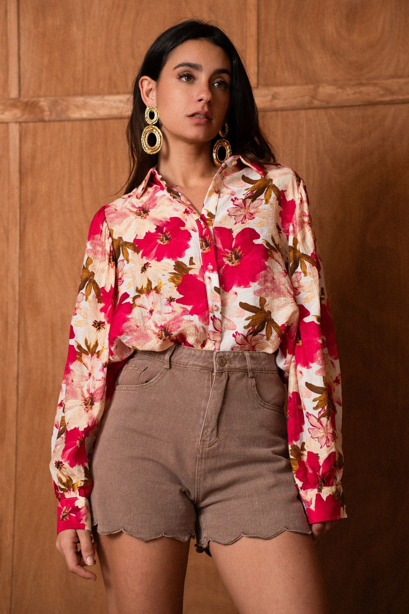 Léontine est une Chemise qui ne passe pas inaperçue. Son imprimé floral fuchsia apporte instantanément de l’éclat à la silhouette, tout en restant élégant et facile à associer. Une pièce pleine de caractère, pensée pour celles qui aiment les couleurs franches et les looks qui donnent bonne mine.