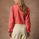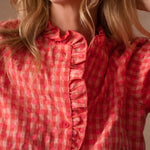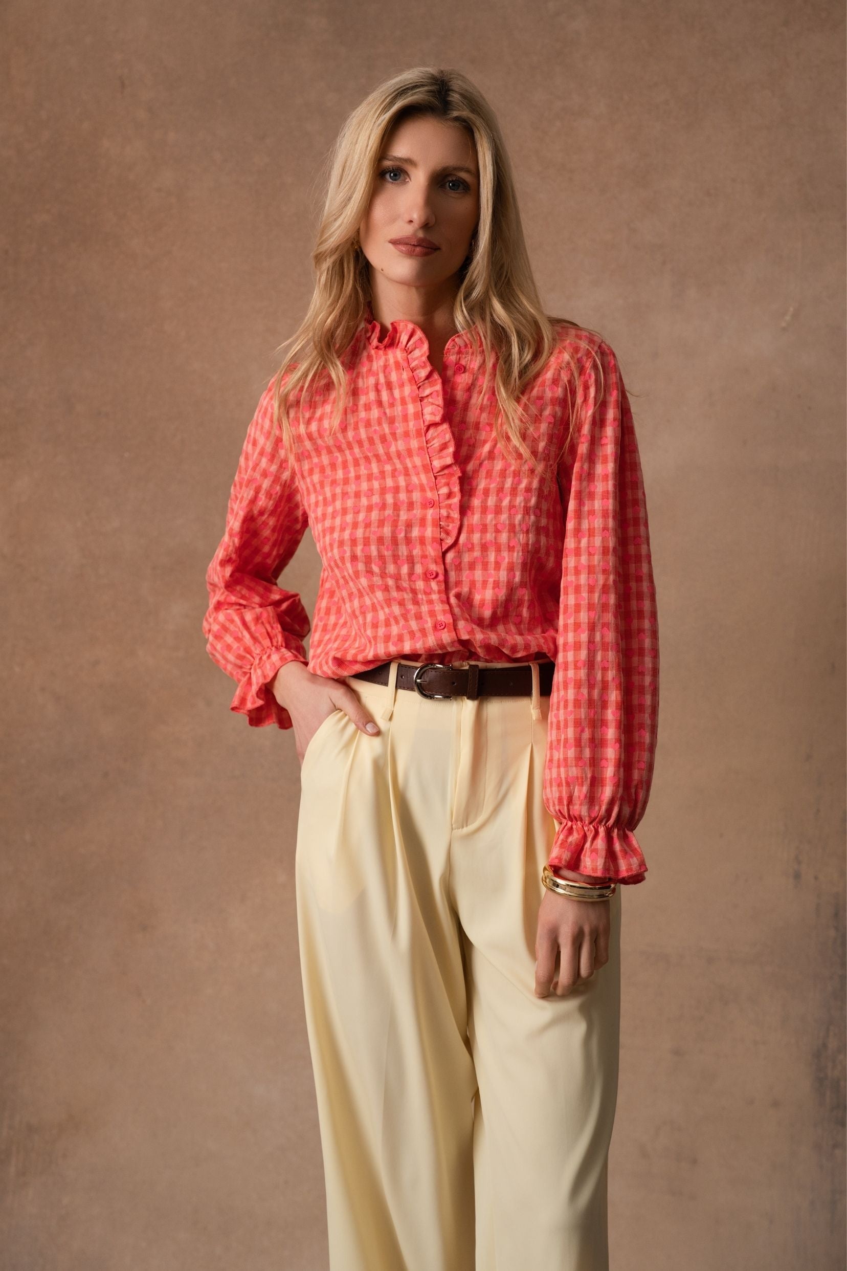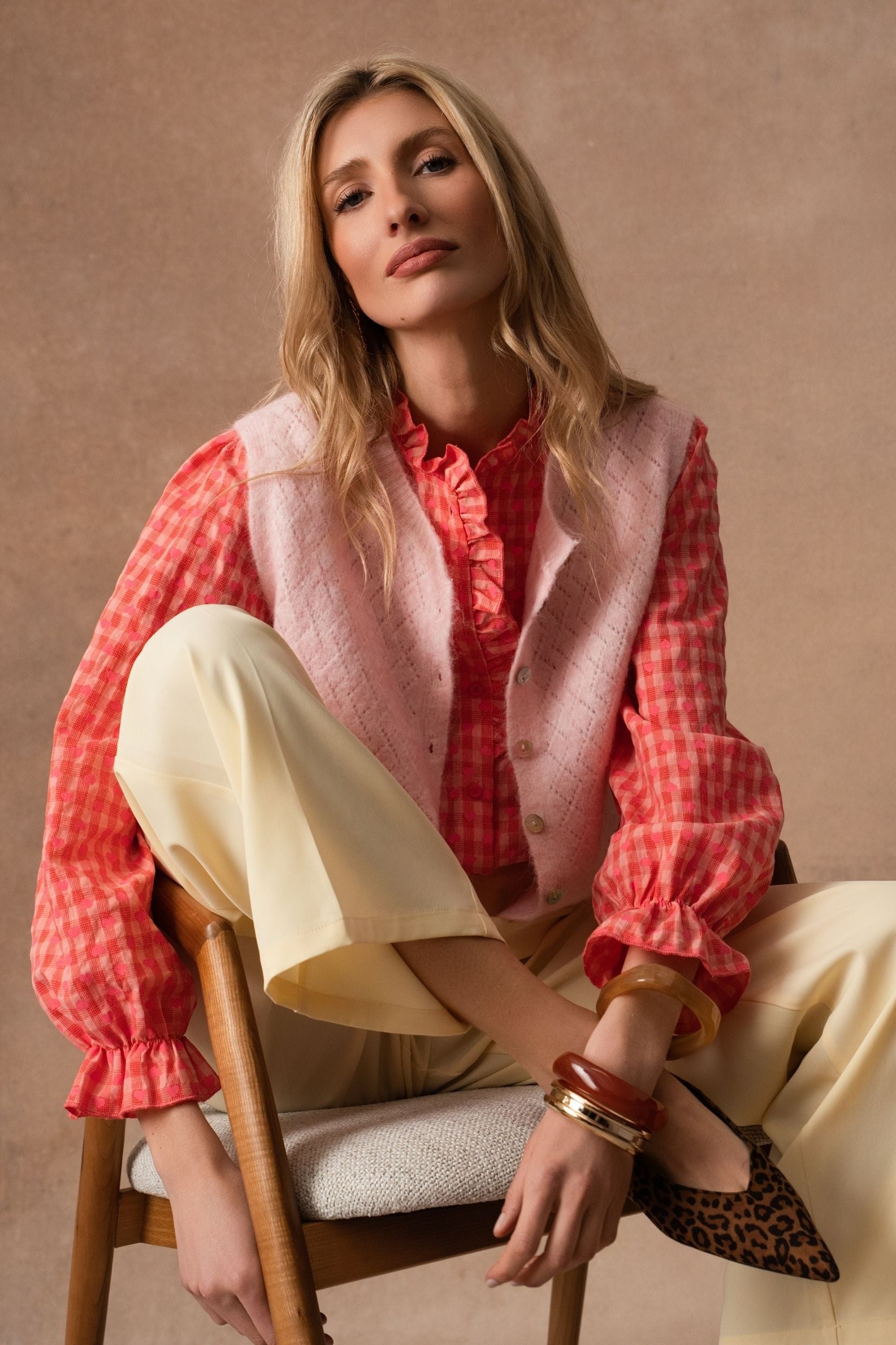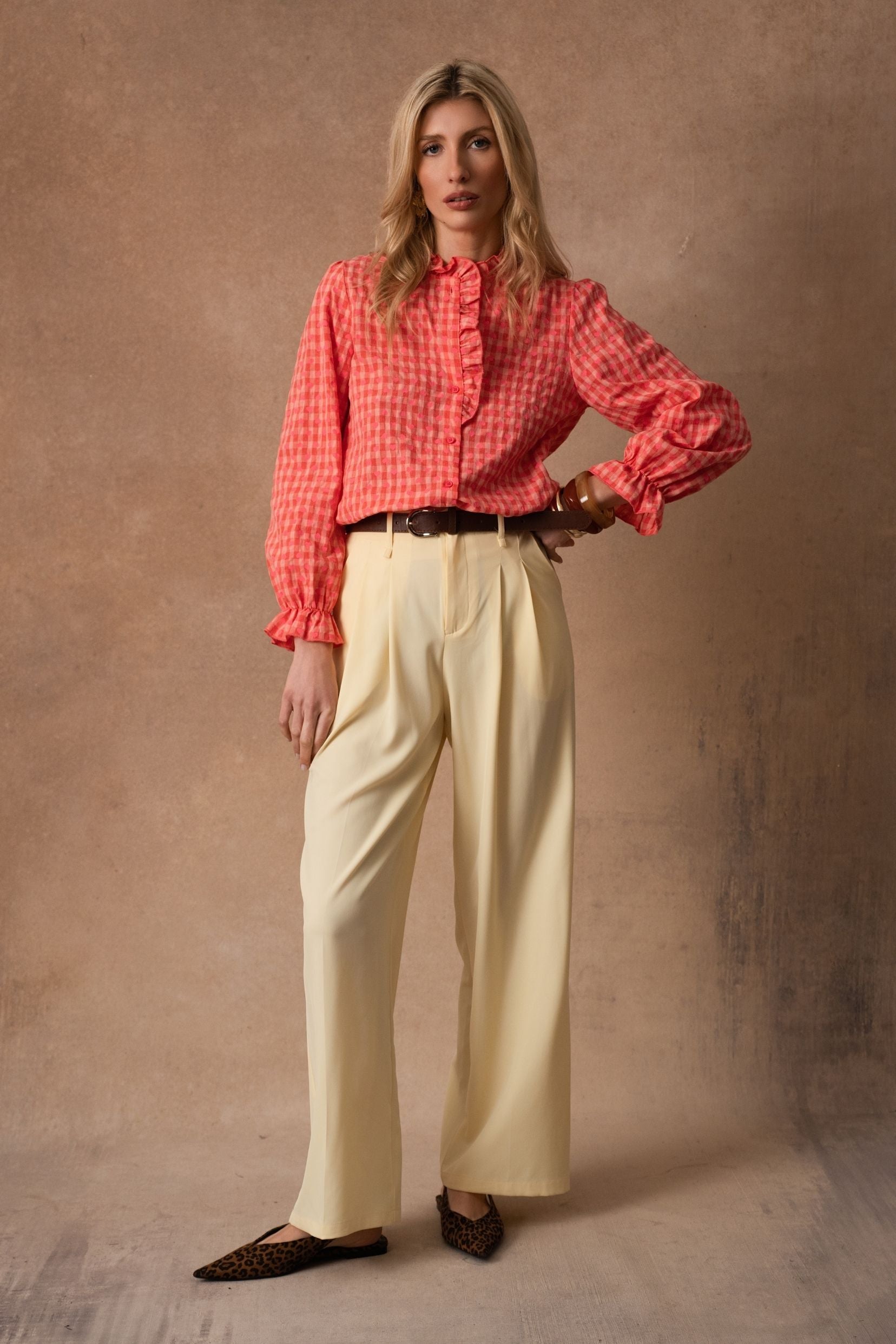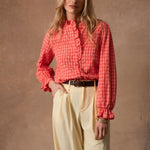La chemise à carreaux Raymonde insuffle une touche chaleureuse et contemporaine au vestiaire. Sa coupe droite équilibre la silhouette avec naturel, tandis que le col délicatement volanté et les poignets froncés apportent une féminité subtile et assumée. Sa matière confortable accompagne les mouvements et se fait oublier au porté.