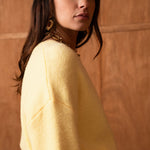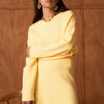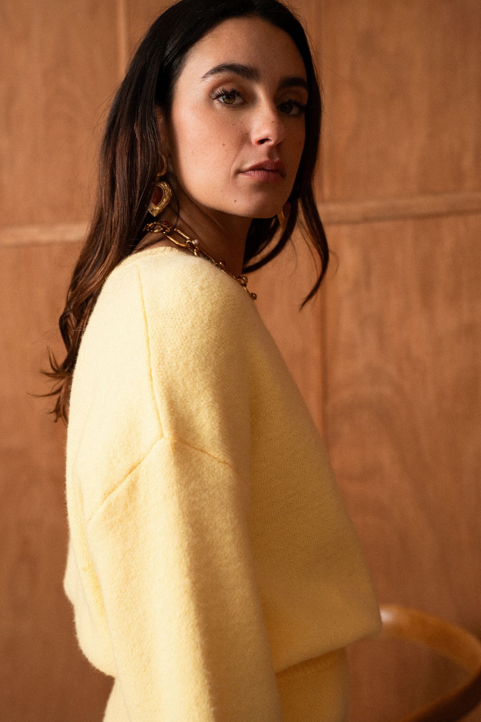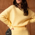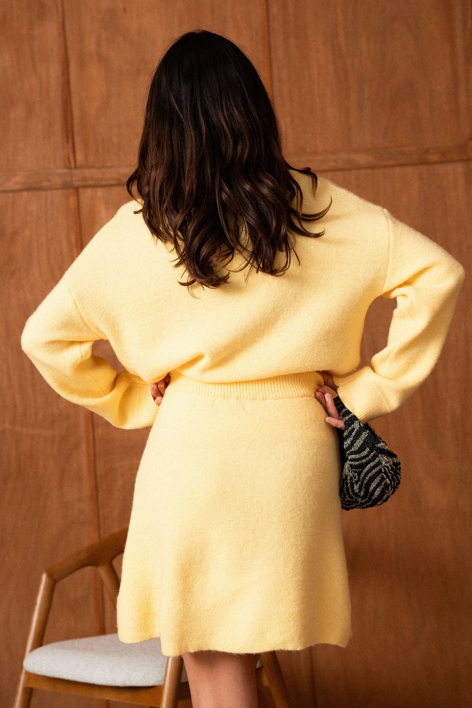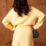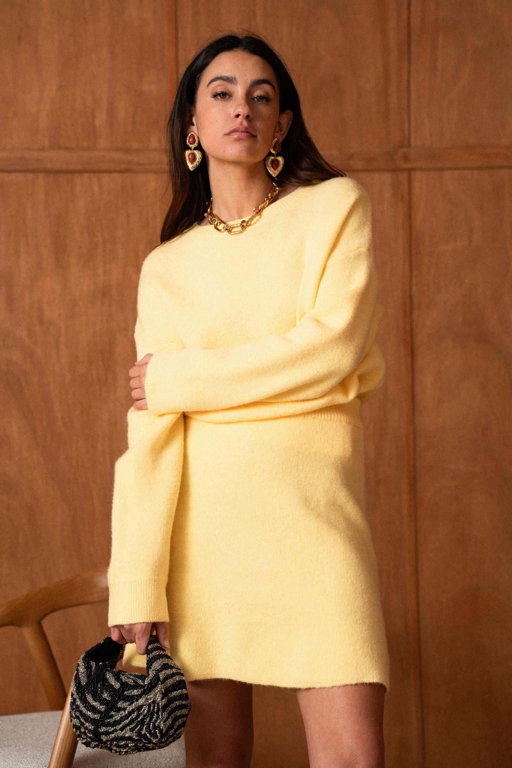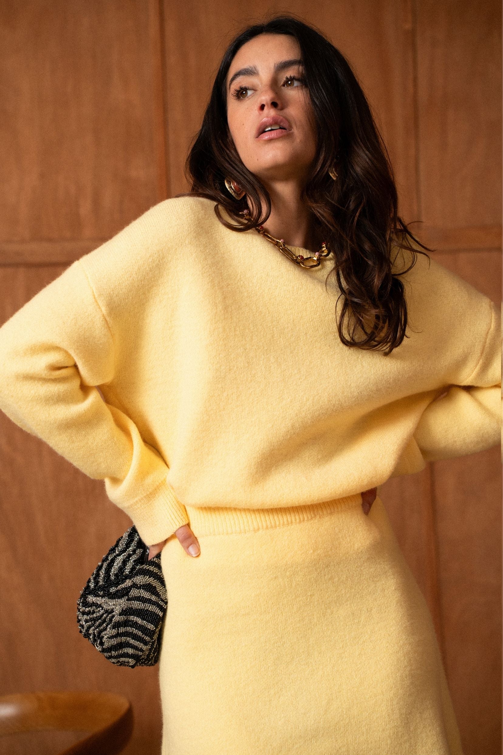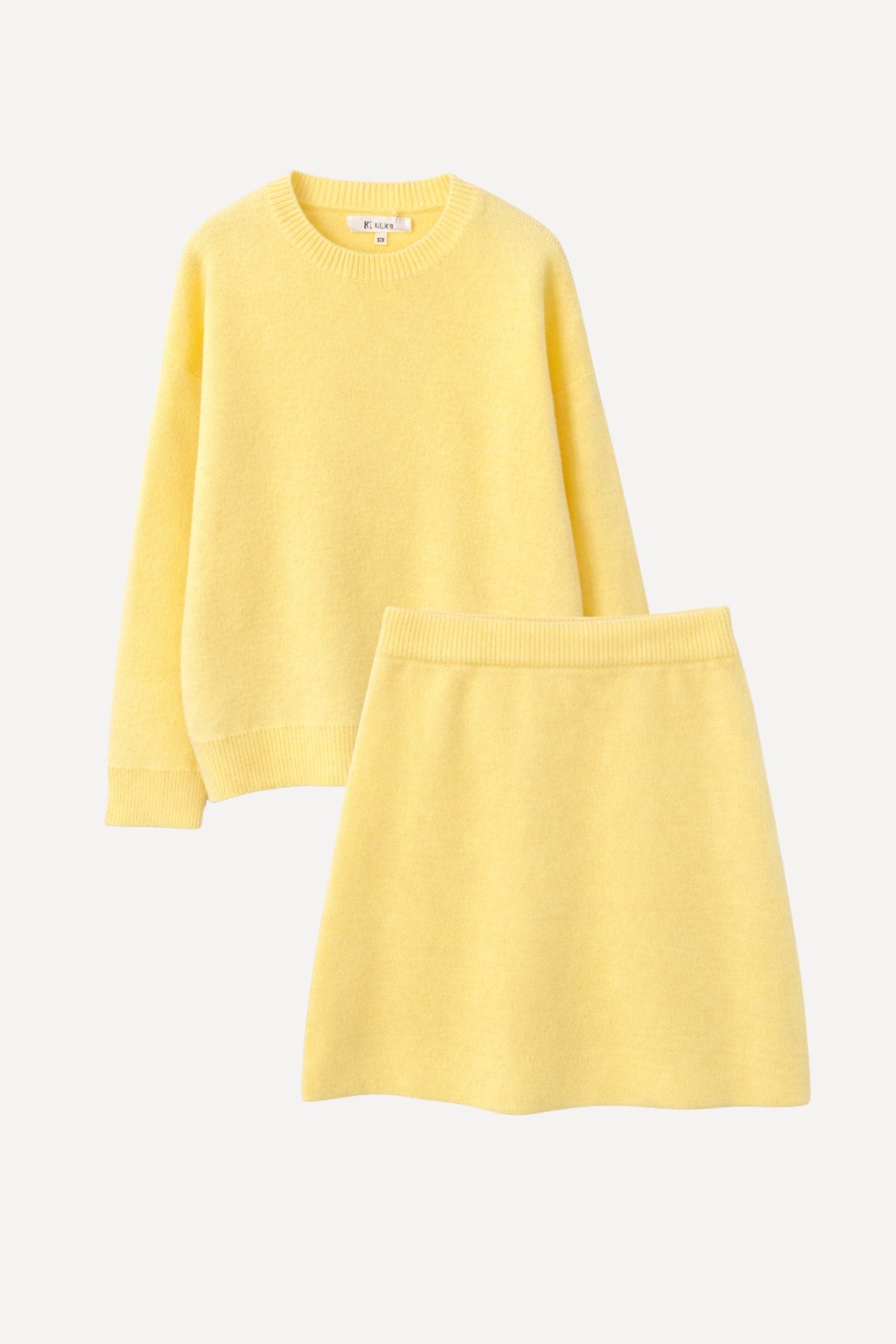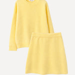 Un ensemble pensé comme une silhouette complète, facile et désirable, où le jaune apporte chaleur et caractère sans jamais en faire trop. Le pull enveloppe le haut du corps avec douceur, tandis que la jupe vient équilibrer la silhouette avec une allure naturellement féminine.