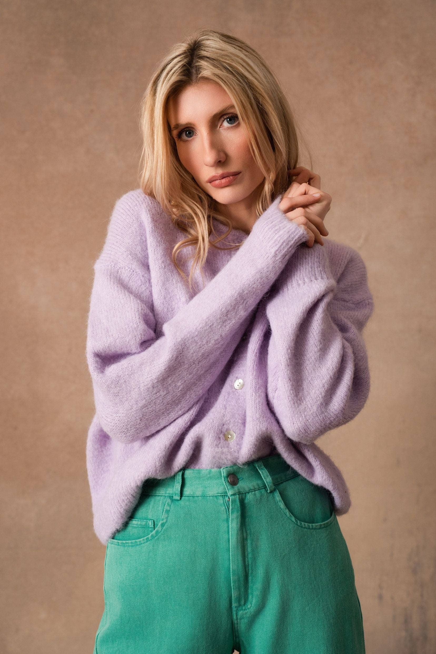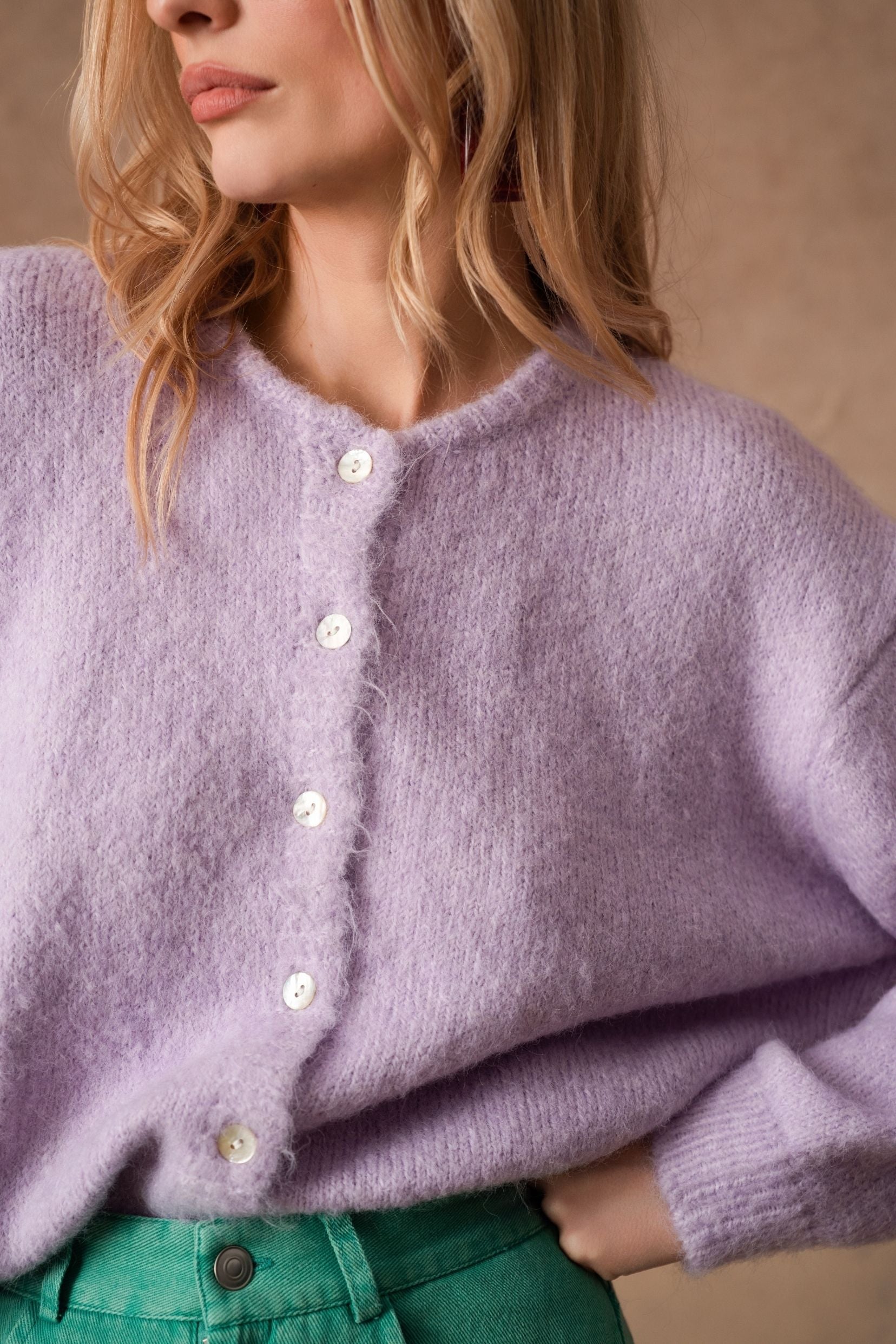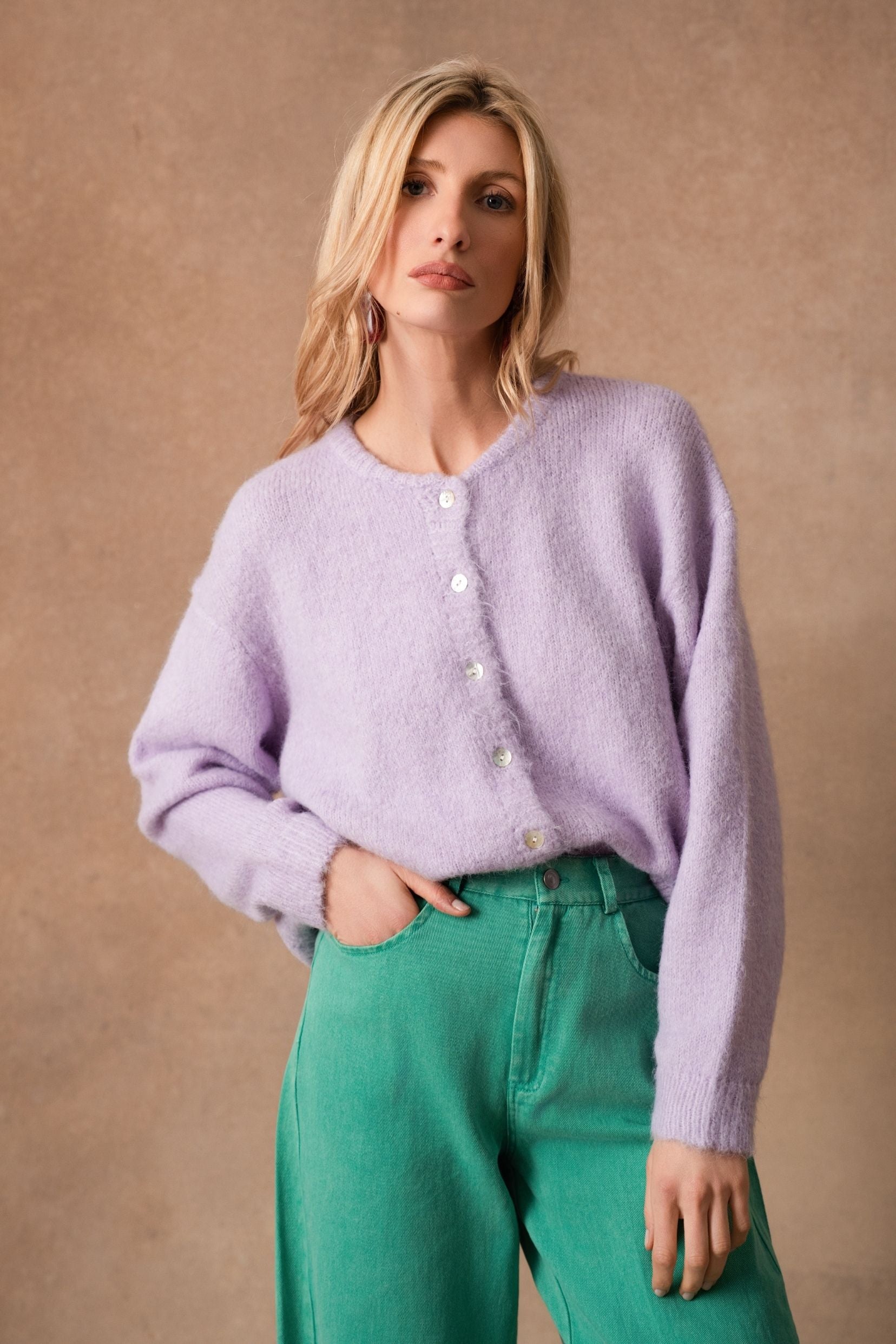 Son col rond et son boutonnage sur le devant dessinent une ligne simple et équilibrée, soulignée par des finitions bord-côtes au col, aux poignets et à la base pour une allure soignée. Porté fermé comme un pull douillet ou ouvert sur une blouse ou une robe fluide, il s’adapte à toutes les envies.