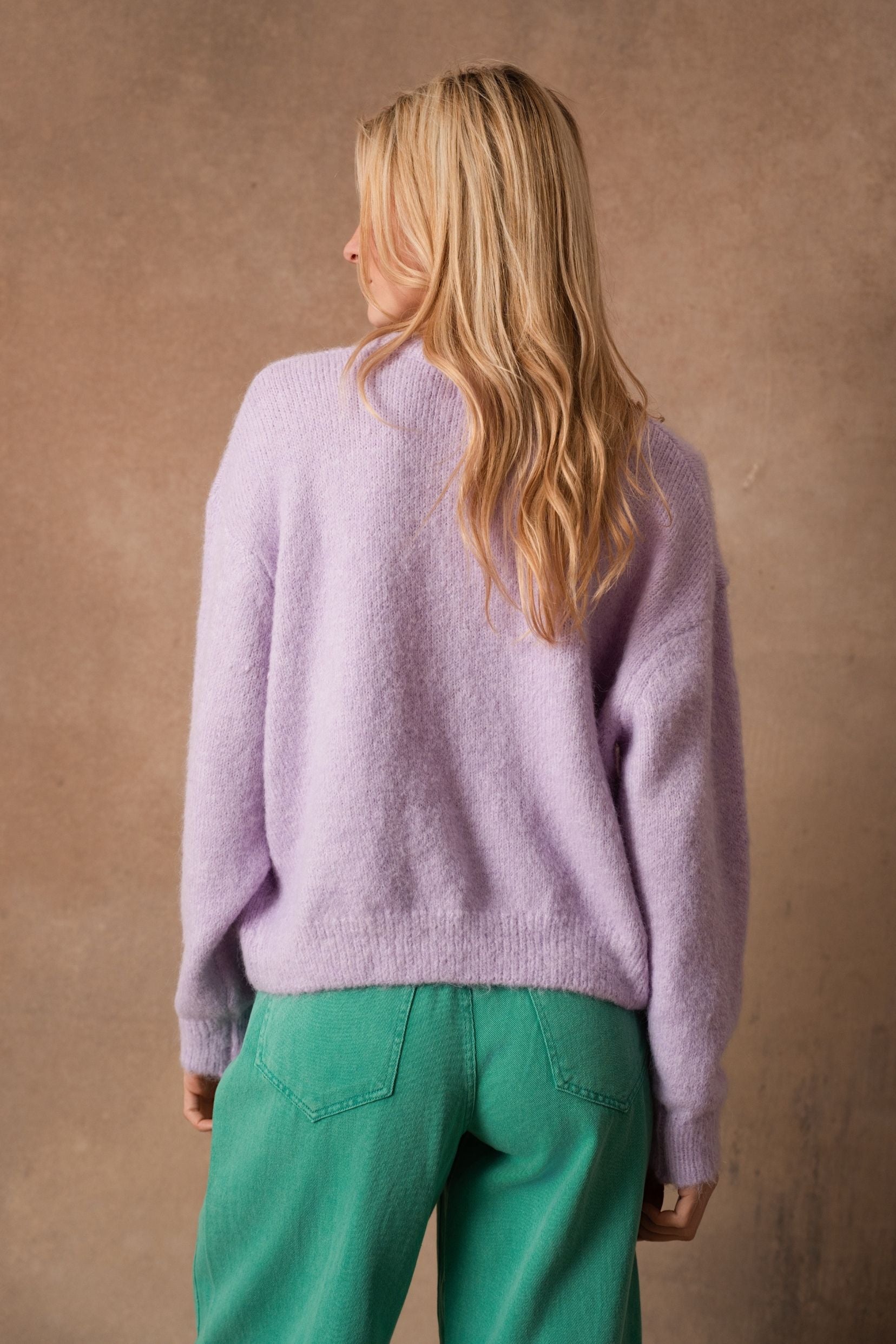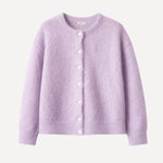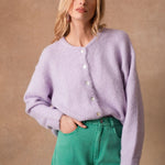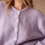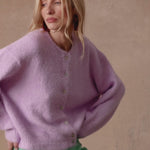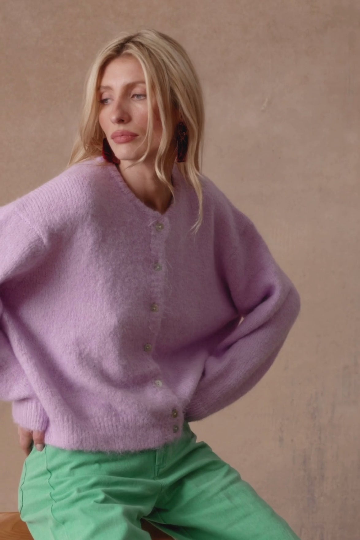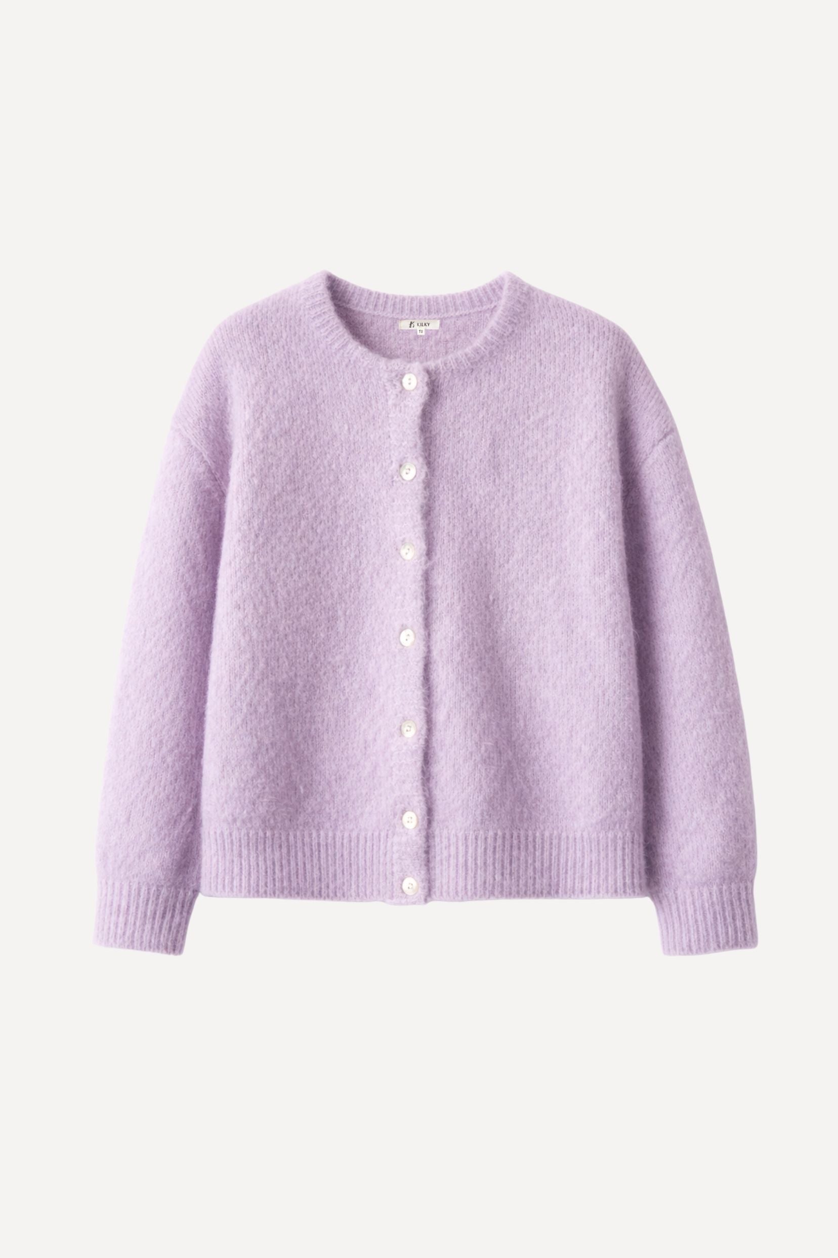 Son col rond et son boutonnage sur le devant dessinent une ligne simple et équilibrée, soulignée par des finitions bord-côtes au col, aux poignets et à la base pour une allure soignée. Porté fermé comme un pull douillet ou ouvert sur une blouse ou une robe fluide, il s’adapte à toutes les envies.