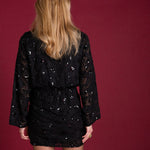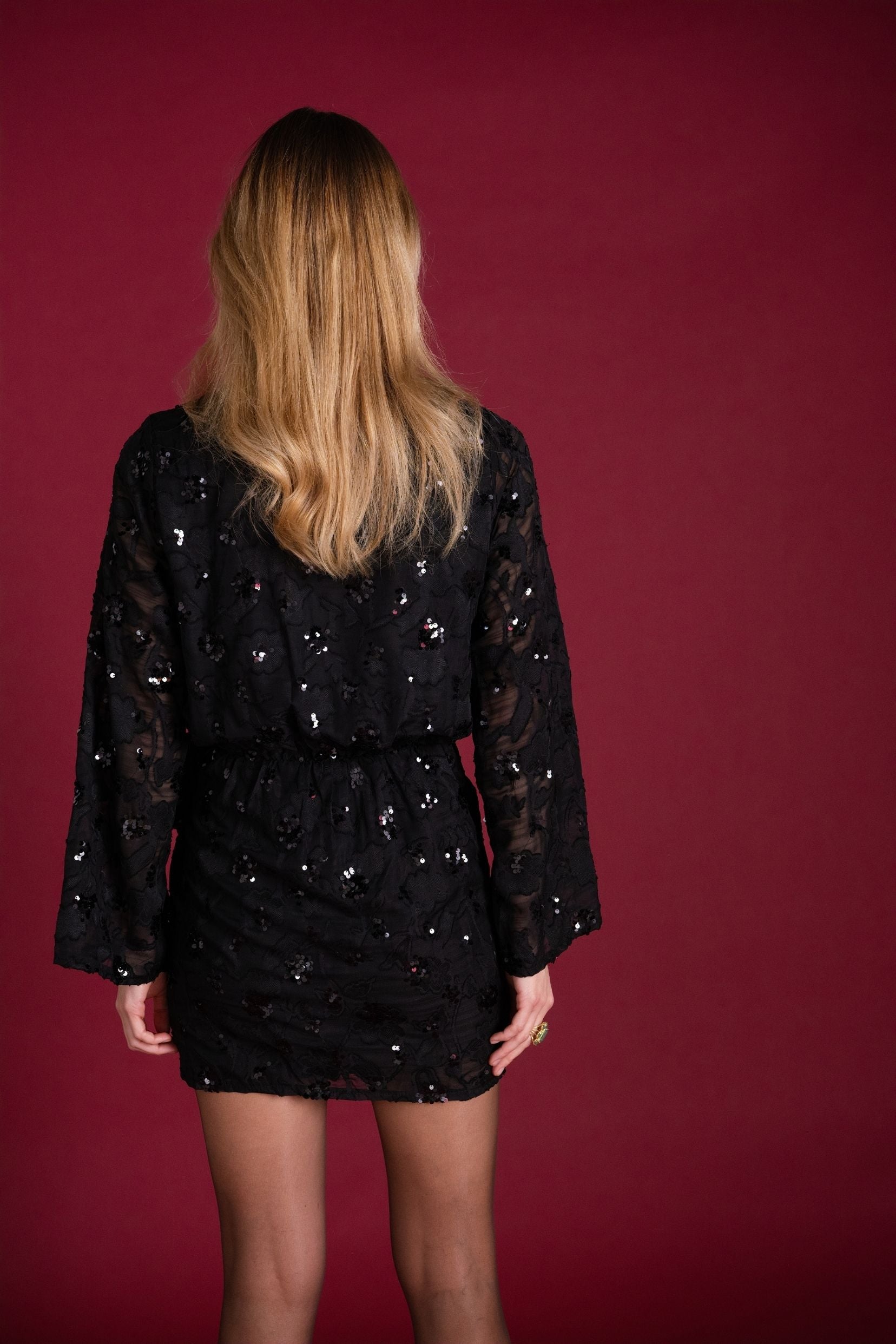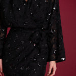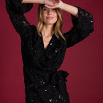 Son tissu noir, délicatement brodé de sequins, crée un relief subtil qui capte la lumière au moindre mouvement comme un éclat discret, presque secret. Une pièce qui mêle douceur, féminité et ce soupçon de mystère qui signe les silhouettes Kilky Paris.